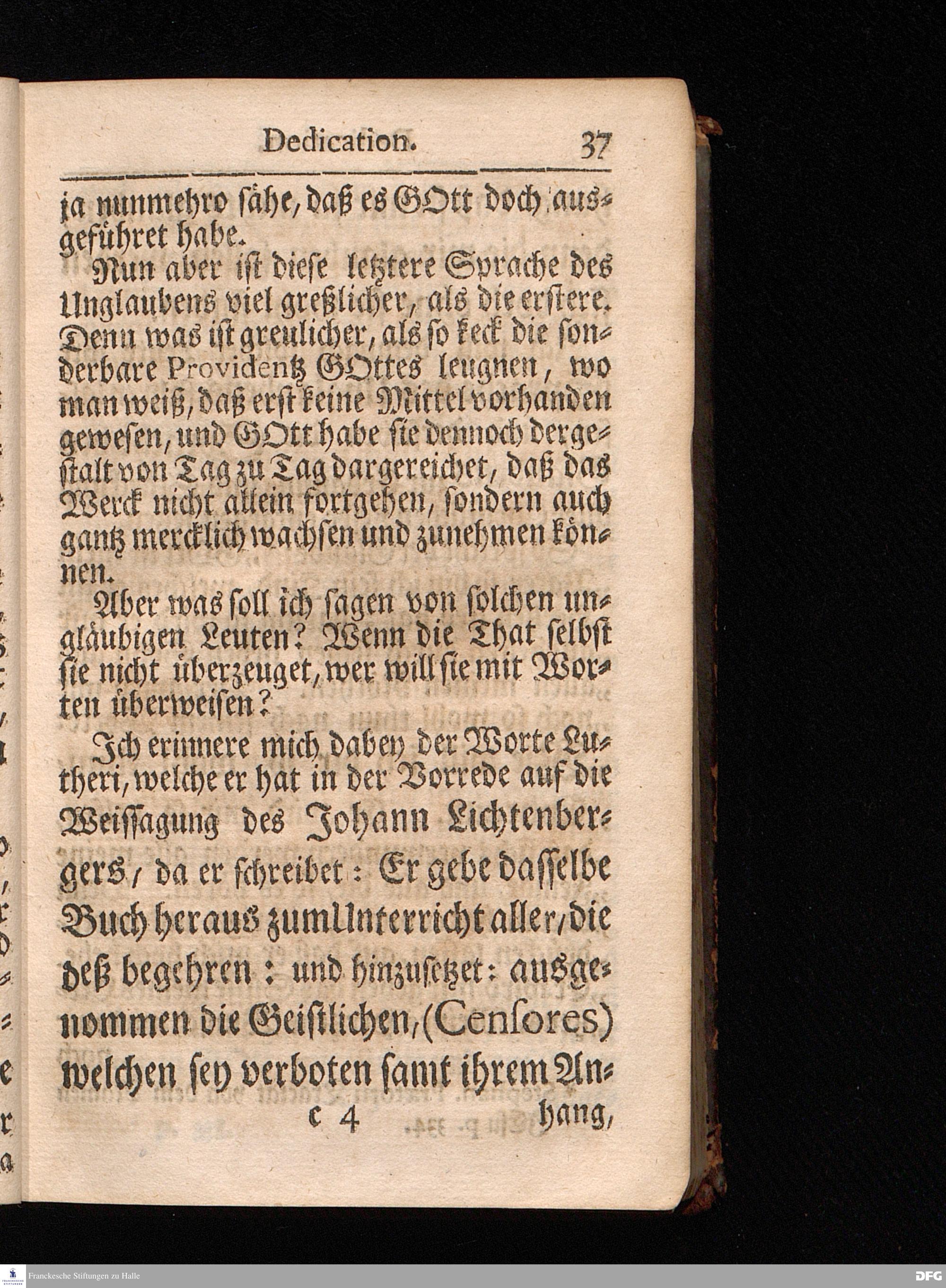 Segens=volle Fußstapfen des noch lebenden und waltenden liebrei=│chen und getreuen GOttes, Zur Beschämung des Unglaubens und Stärckung des Glaubens, entdecket durch eine wahrhafte und umständliche Nachricht von dem Wäysen=Hause und übrigen Anstalten zu Glaucha vor Halle; Welche Im Jahr 1701. zum Druck befördert, ietzo aber zum dritten mal ediret, und bis auf gegenwärtiges Jahr fortgesetzet von August Hermann Francken, S.Theol.Prof.und Past. HALLE, in Verlegung des Wäysen=Hauses, MDCCIX.