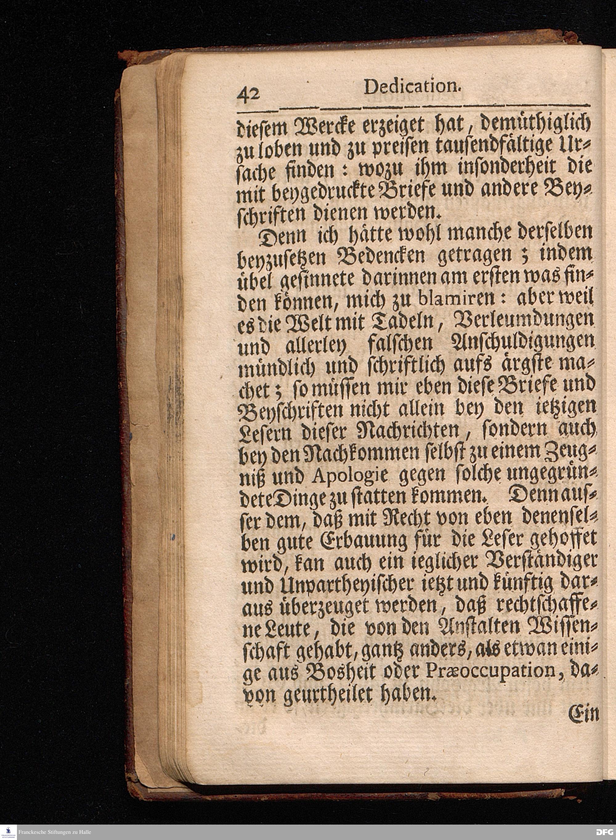 Segens=volle Fußstapfen des noch lebenden und waltenden liebrei=│chen und getreuen GOttes, Zur Beschämung des Unglaubens und Stärckung des Glaubens, entdecket durch eine wahrhafte und umständliche Nachricht von dem Wäysen=Hause und übrigen Anstalten zu Glaucha vor Halle; Welche Im Jahr 1701. zum Druck befördert, ietzo aber zum dritten mal ediret, und bis auf gegenwärtiges Jahr fortgesetzet von August Hermann Francken, S.Theol.Prof.und Past. HALLE, in Verlegung des Wäysen=Hauses, MDCCIX.