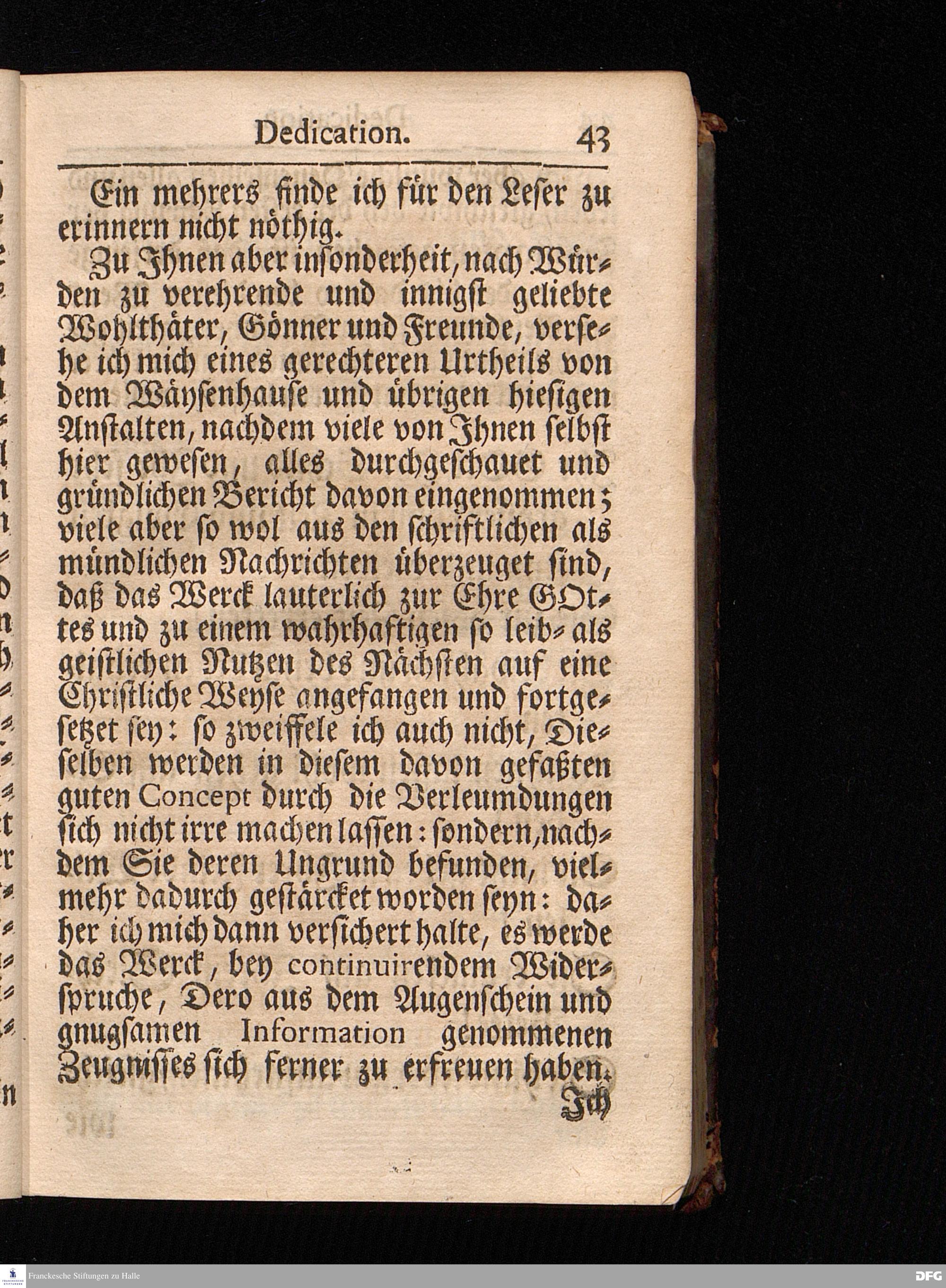Segens=volle Fußstapfen des noch lebenden und waltenden liebrei=│chen und getreuen GOttes, Zur Beschämung des Unglaubens und Stärckung des Glaubens, entdecket durch eine wahrhafte und umständliche Nachricht von dem Wäysen=Hause und übrigen Anstalten zu Glaucha vor Halle; Welche Im Jahr 1701. zum Druck befördert, ietzo aber zum dritten mal ediret, und bis auf gegenwärtiges Jahr fortgesetzet von August Hermann Francken, S.Theol.Prof.und Past. HALLE, in Verlegung des Wäysen=Hauses, MDCCIX.