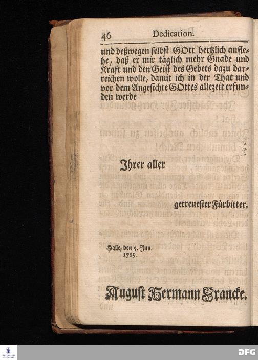 Segens=volle Fußstapfen des noch lebenden und waltenden liebrei=│chen und getreuen GOttes, Zur Beschämung des Unglaubens und Stärckung des Glaubens, entdecket durch eine wahrhafte und umständliche Nachricht von dem Wäysen=Hause und übrigen Anstalten zu Glaucha vor Halle; Welche Im Jahr 1701. zum Druck befördert, ietzo aber zum dritten mal ediret, und bis auf gegenwärtiges Jahr fortgesetzet von August Hermann Francken, S.Theol.Prof.und Past. HALLE, in Verlegung des Wäysen=Hauses, MDCCIX.