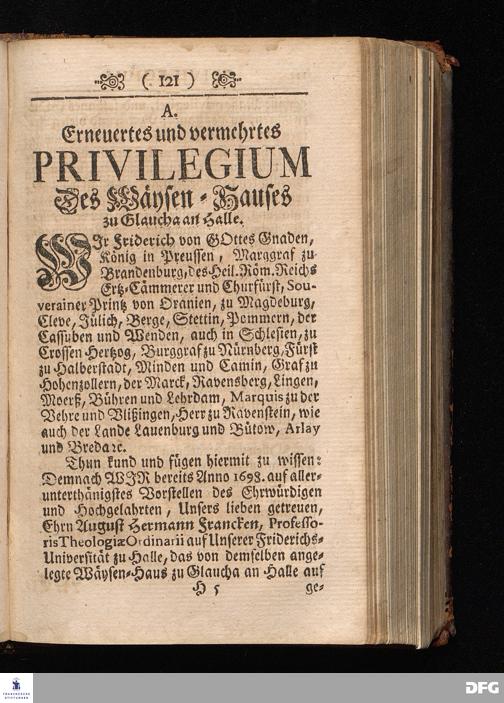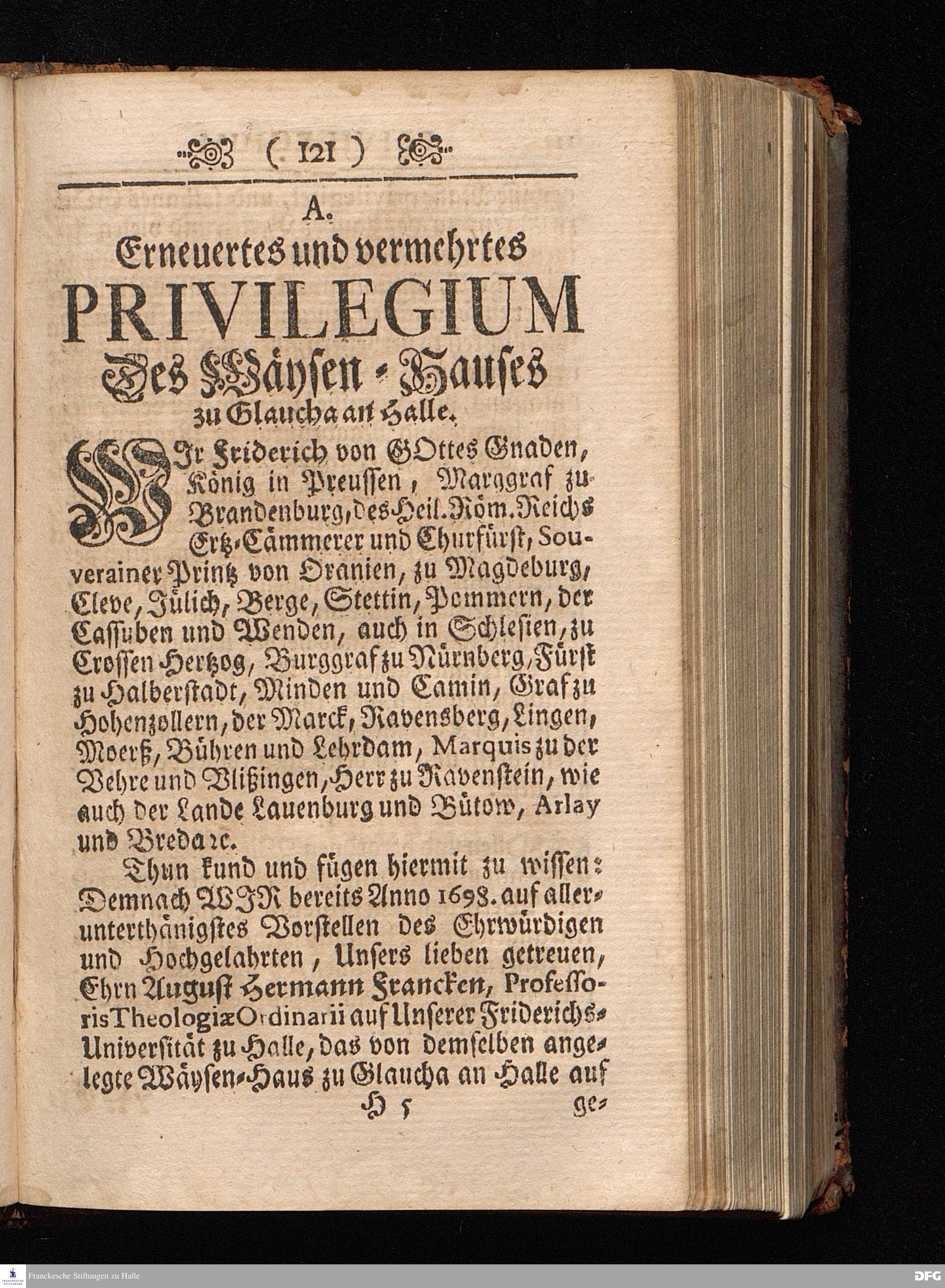 Segens=volle Fußstapfen des noch lebenden und waltenden liebrei=│chen und getreuen GOttes, Zur Beschämung des Unglaubens und Stärckung des Glaubens, entdecket durch eine wahrhafte und umständliche Nachricht von dem Wäysen=Hause und übrigen Anstalten zu Glaucha vor Halle; Welche Im Jahr 1701. zum Druck befördert, ietzo aber zum dritten mal ediret, und bis auf gegenwärtiges Jahr fortgesetzet von August Hermann Francken, S.Theol.Prof.und Past. HALLE, in Verlegung des Wäysen=Hauses, MDCCIX.