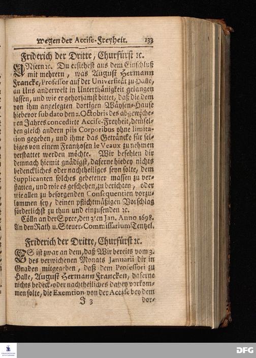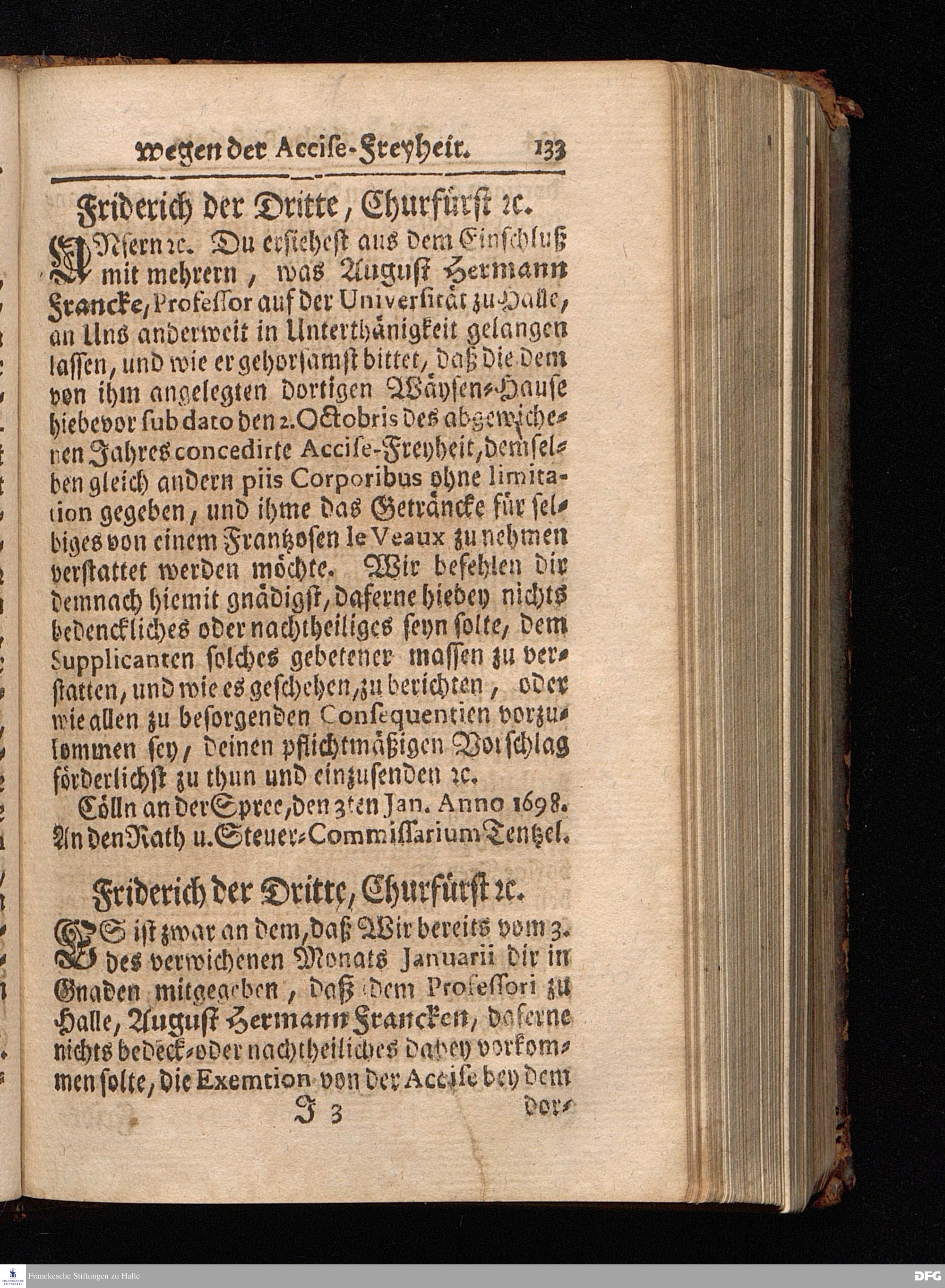 Segens=volle Fußstapfen des noch lebenden und waltenden liebrei=│chen und getreuen GOttes, Zur Beschämung des Unglaubens und Stärckung des Glaubens, entdecket durch eine wahrhafte und umständliche Nachricht von dem Wäysen=Hause und übrigen Anstalten zu Glaucha vor Halle; Welche Im Jahr 1701. zum Druck befördert, ietzo aber zum dritten mal ediret, und bis auf gegenwärtiges Jahr fortgesetzet von August Hermann Francken, S.Theol.Prof.und Past. HALLE, in Verlegung des Wäysen=Hauses, MDCCIX.