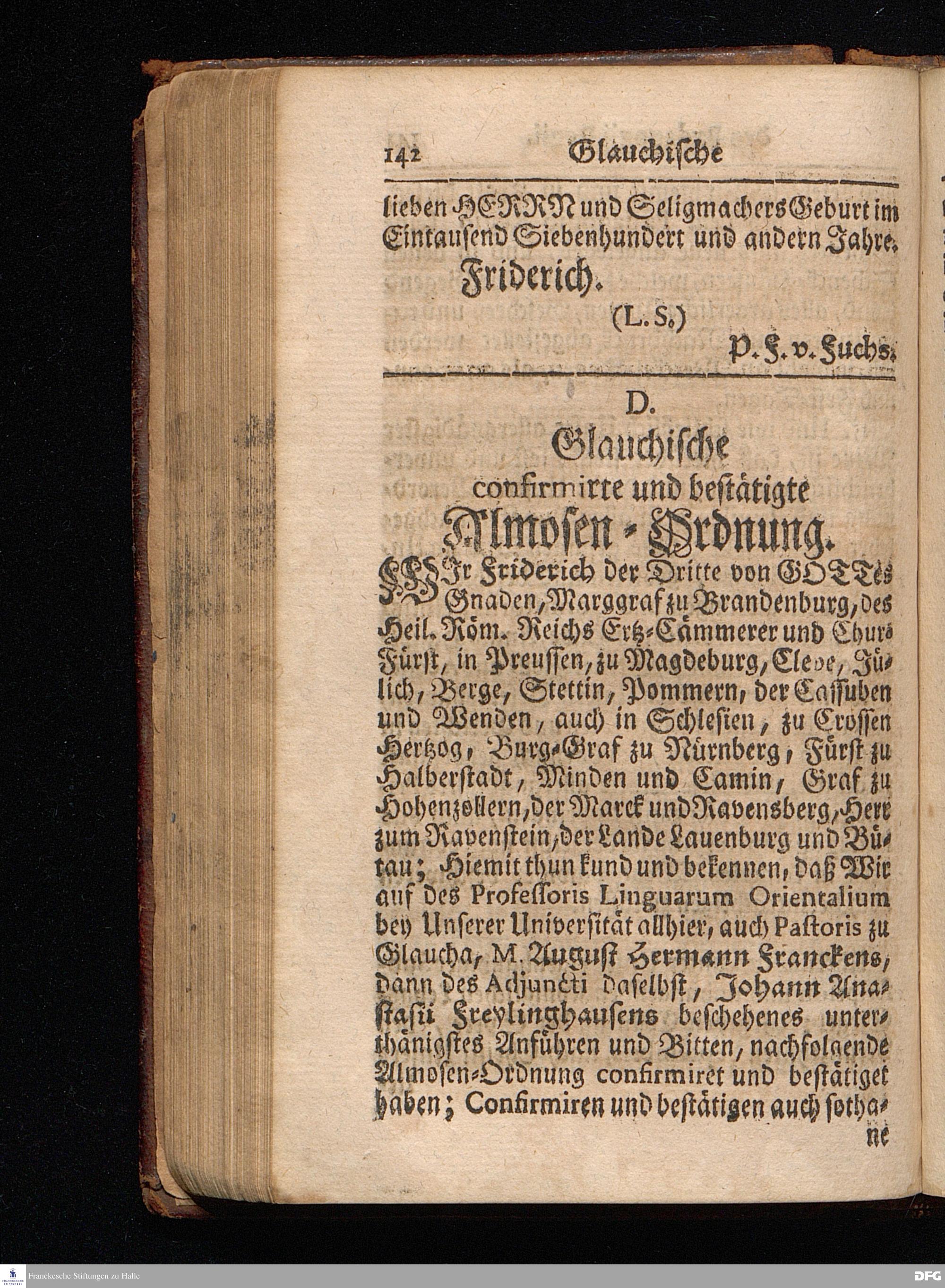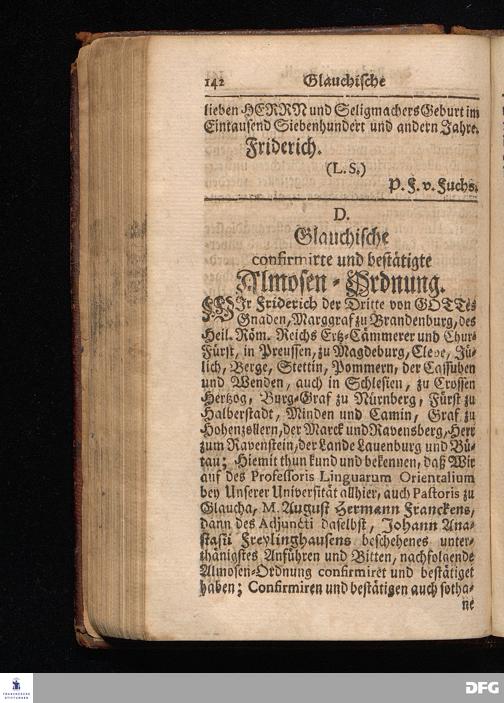 Segens=volle Fußstapfen des noch lebenden und waltenden liebrei=│chen und getreuen GOttes, Zur Beschämung des Unglaubens und Stärckung des Glaubens, entdecket durch eine wahrhafte und umständliche Nachricht von dem Wäysen=Hause und übrigen Anstalten zu Glaucha vor Halle; Welche Im Jahr 1701. zum Druck befördert, ietzo aber zum dritten mal ediret, und bis auf gegenwärtiges Jahr fortgesetzet von August Hermann Francken, S.Theol.Prof.und Past. HALLE, in Verlegung des Wäysen=Hauses, MDCCIX.