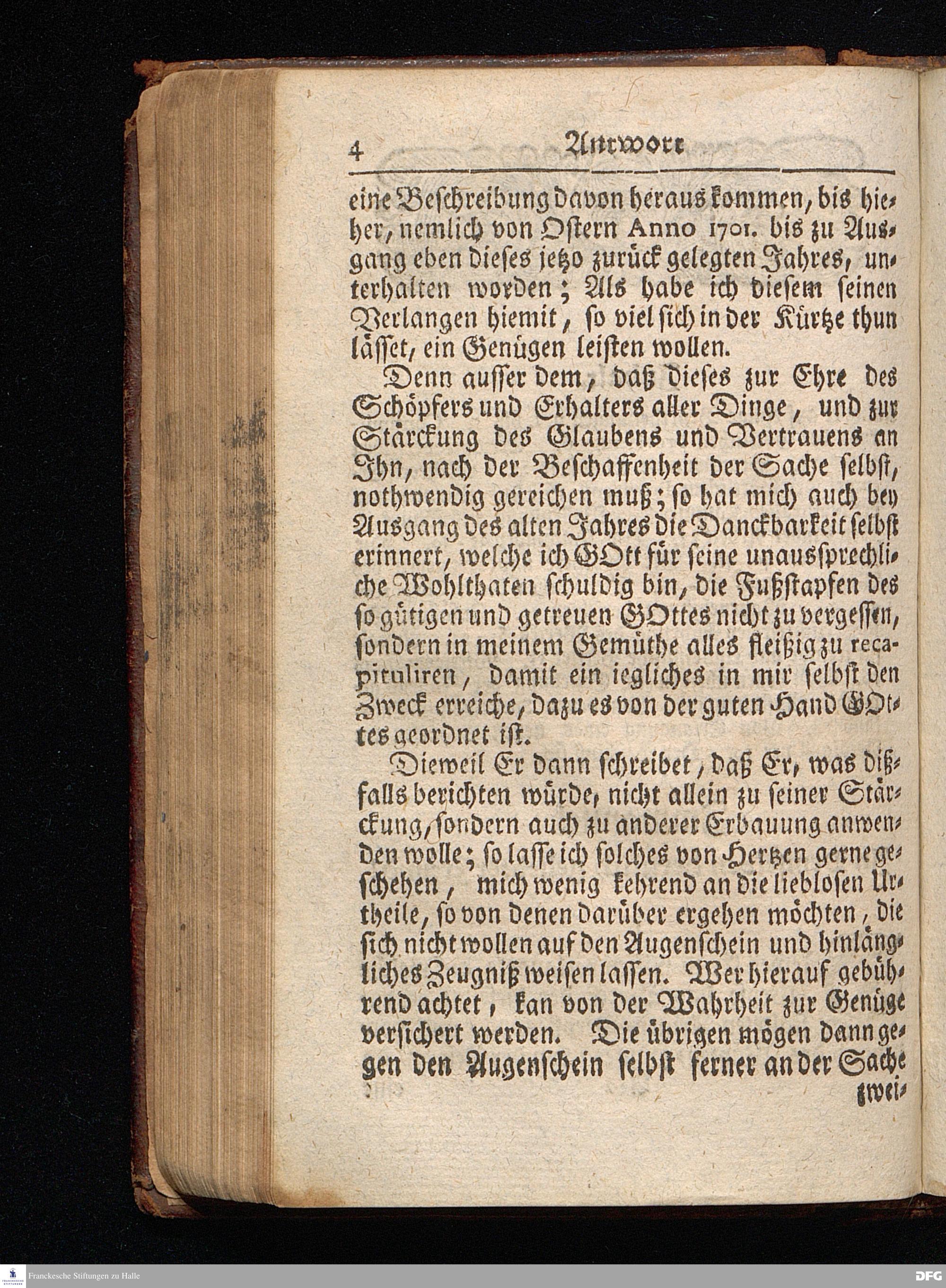 Segens=volle Fußstapfen des noch lebenden und waltenden liebrei=│chen und getreuen GOttes, Zur Beschämung des Unglaubens und Stärckung des Glaubens, entdecket durch eine wahrhafte und umständliche Nachricht von dem Wäysen=Hause und übrigen Anstalten zu Glaucha vor Halle; Welche Im Jahr 1701. zum Druck befördert, ietzo aber zum dritten mal ediret, und bis auf gegenwärtiges Jahr fortgesetzet von August Hermann Francken, S.Theol.Prof.und Past. HALLE, in Verlegung des Wäysen=Hauses, MDCCIX.