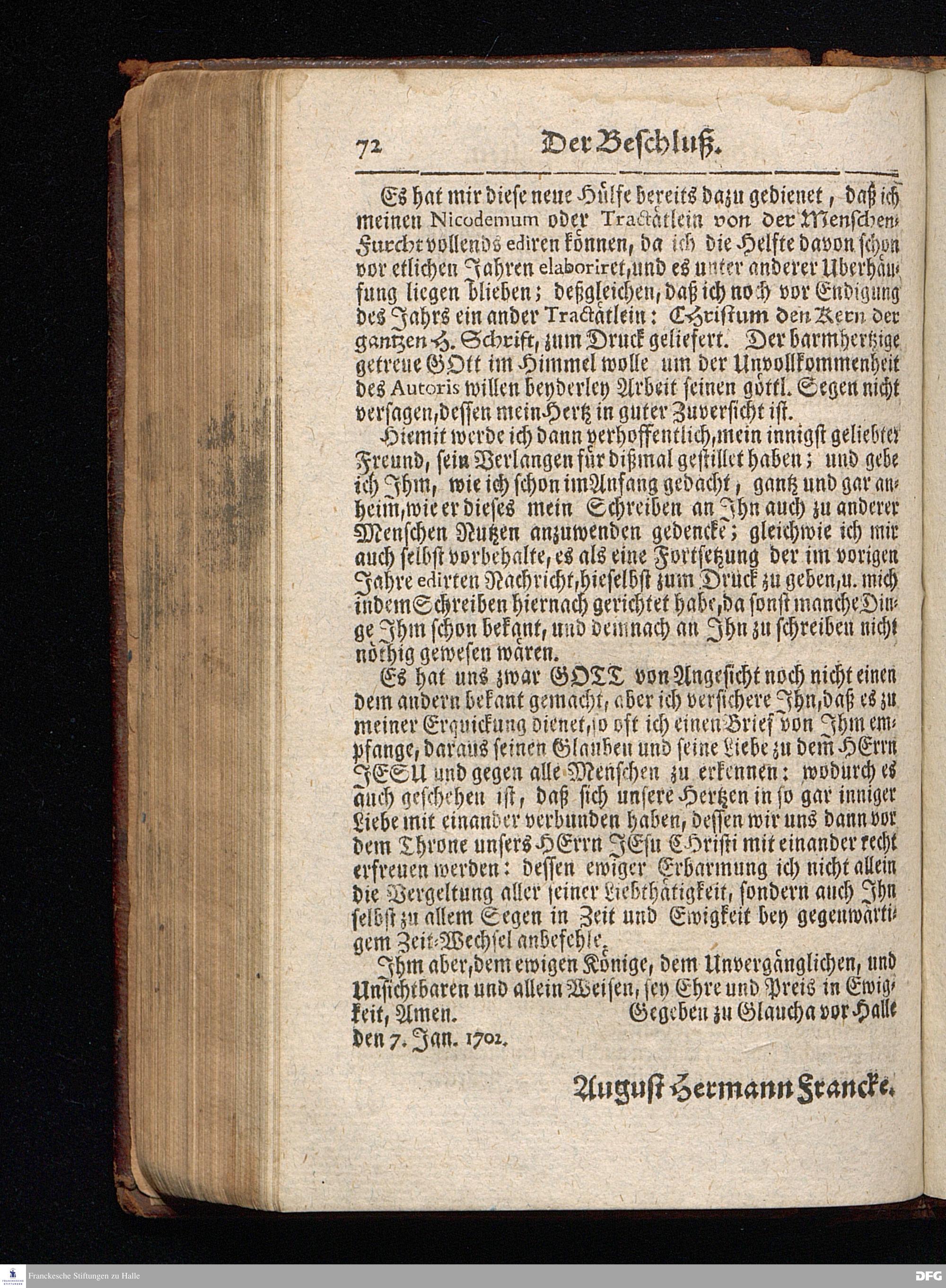 Segens=volle Fußstapfen des noch lebenden und waltenden liebrei=│chen und getreuen GOttes, Zur Beschämung des Unglaubens und Stärckung des Glaubens, entdecket durch eine wahrhafte und umständliche Nachricht von dem Wäysen=Hause und übrigen Anstalten zu Glaucha vor Halle; Welche Im Jahr 1701. zum Druck befördert, ietzo aber zum dritten mal ediret, und bis auf gegenwärtiges Jahr fortgesetzet von August Hermann Francken, S.Theol.Prof.und Past. HALLE, in Verlegung des Wäysen=Hauses, MDCCIX.