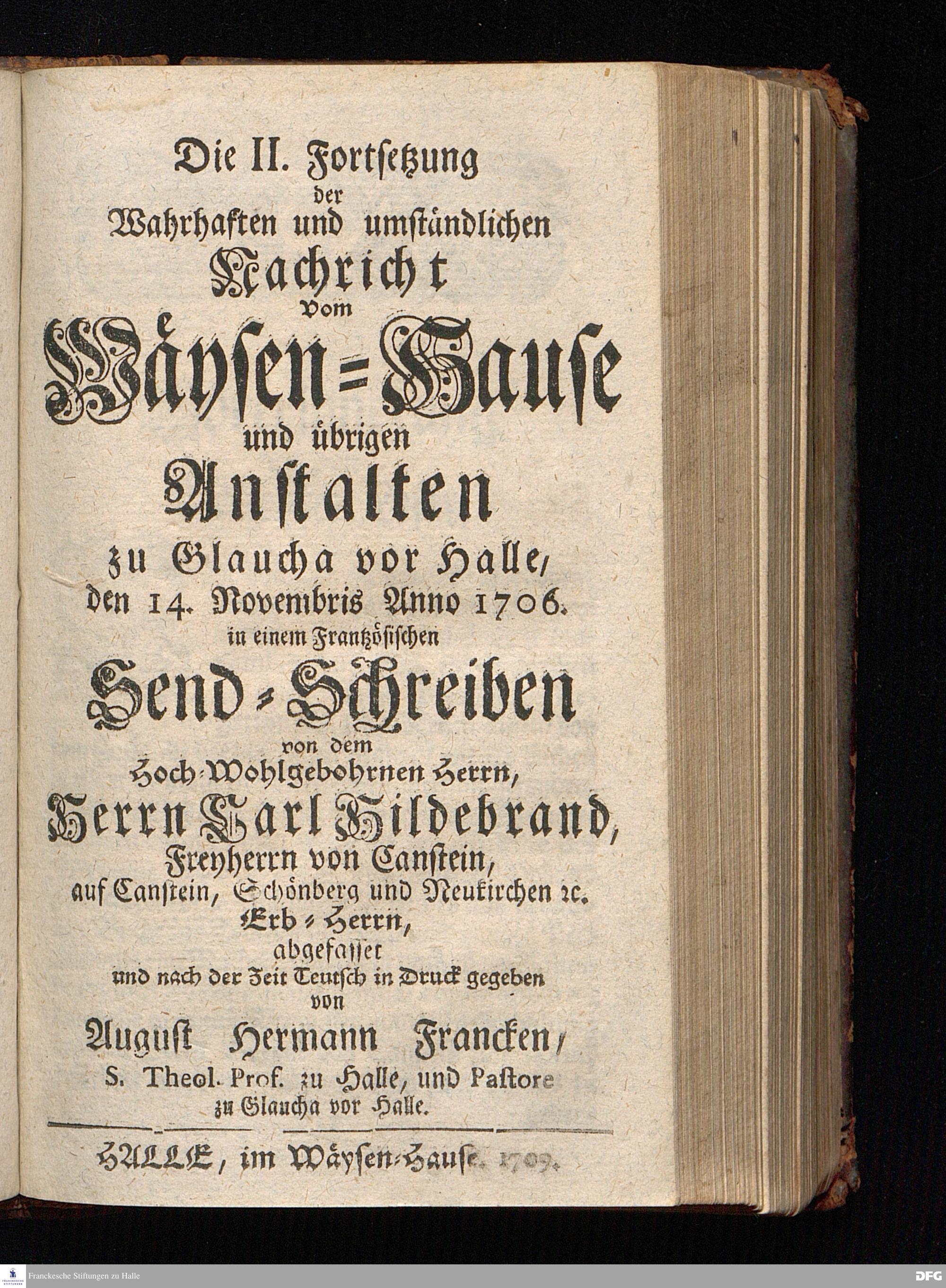 Segens=volle Fußstapfen des noch lebenden und waltenden liebrei=│chen und getreuen GOttes, Zur Beschämung des Unglaubens und Stärckung des Glaubens, entdecket durch eine wahrhafte und umständliche Nachricht von dem Wäysen=Hause und übrigen Anstalten zu Glaucha vor Halle; Welche Im Jahr 1701. zum Druck befördert, ietzo aber zum dritten mal ediret, und bis auf gegenwärtiges Jahr fortgesetzet von August Hermann Francken, S.Theol.Prof.und Past. HALLE, in Verlegung des Wäysen=Hauses, MDCCIX.