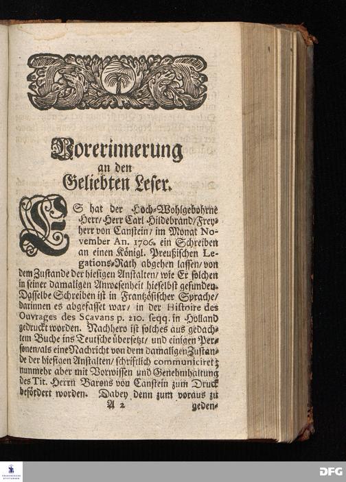 Segens=volle Fußstapfen des noch lebenden und waltenden liebrei=│chen und getreuen GOttes, Zur Beschämung des Unglaubens und Stärckung des Glaubens, entdecket durch eine wahrhafte und umständliche Nachricht von dem Wäysen=Hause und übrigen Anstalten zu Glaucha vor Halle; Welche Im Jahr 1701. zum Druck befördert, ietzo aber zum dritten mal ediret, und bis auf gegenwärtiges Jahr fortgesetzet von August Hermann Francken, S.Theol.Prof.und Past. HALLE, in Verlegung des Wäysen=Hauses, MDCCIX.