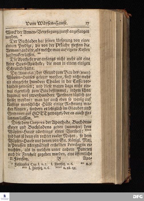 Segens=volle Fußstapfen des noch lebenden und waltenden liebrei=│chen und getreuen GOttes, Zur Beschämung des Unglaubens und Stärckung des Glaubens, entdecket durch eine wahrhafte und umständliche Nachricht von dem Wäysen=Hause und übrigen Anstalten zu Glaucha vor Halle; Welche Im Jahr 1701. zum Druck befördert, ietzo aber zum dritten mal ediret, und bis auf gegenwärtiges Jahr fortgesetzet von August Hermann Francken, S.Theol.Prof.und Past. HALLE, in Verlegung des Wäysen=Hauses, MDCCIX.