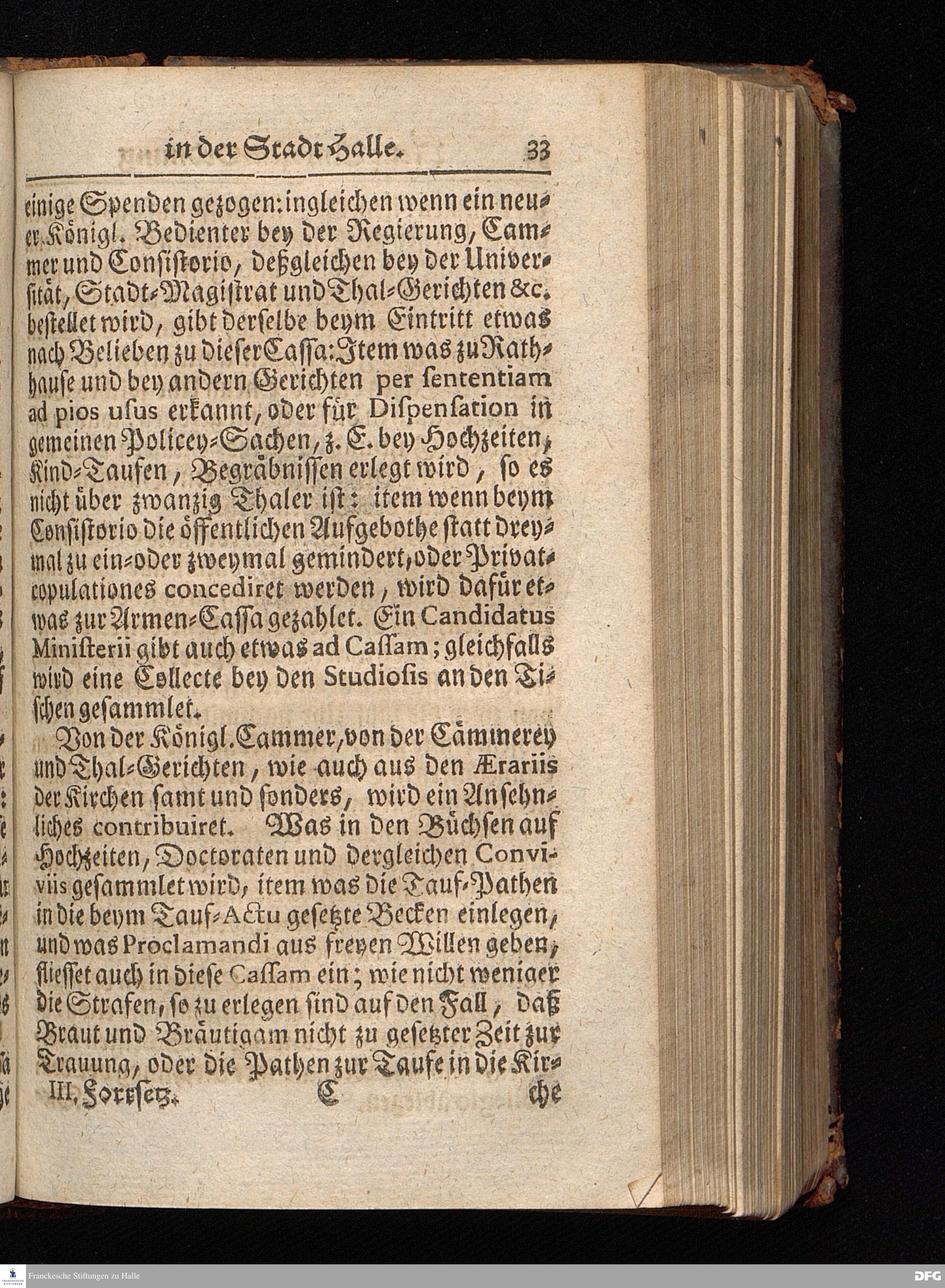 Segens=volle Fußstapfen des noch lebenden und waltenden liebrei=│chen und getreuen GOttes, Zur Beschämung des Unglaubens und Stärckung des Glaubens, entdecket durch eine wahrhafte und umständliche Nachricht von dem Wäysen=Hause und übrigen Anstalten zu Glaucha vor Halle; Welche Im Jahr 1701. zum Druck befördert, ietzo aber zum dritten mal ediret, und bis auf gegenwärtiges Jahr fortgesetzet von August Hermann Francken, S.Theol.Prof.und Past. HALLE, in Verlegung des Wäysen=Hauses, MDCCIX.