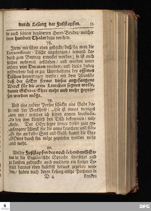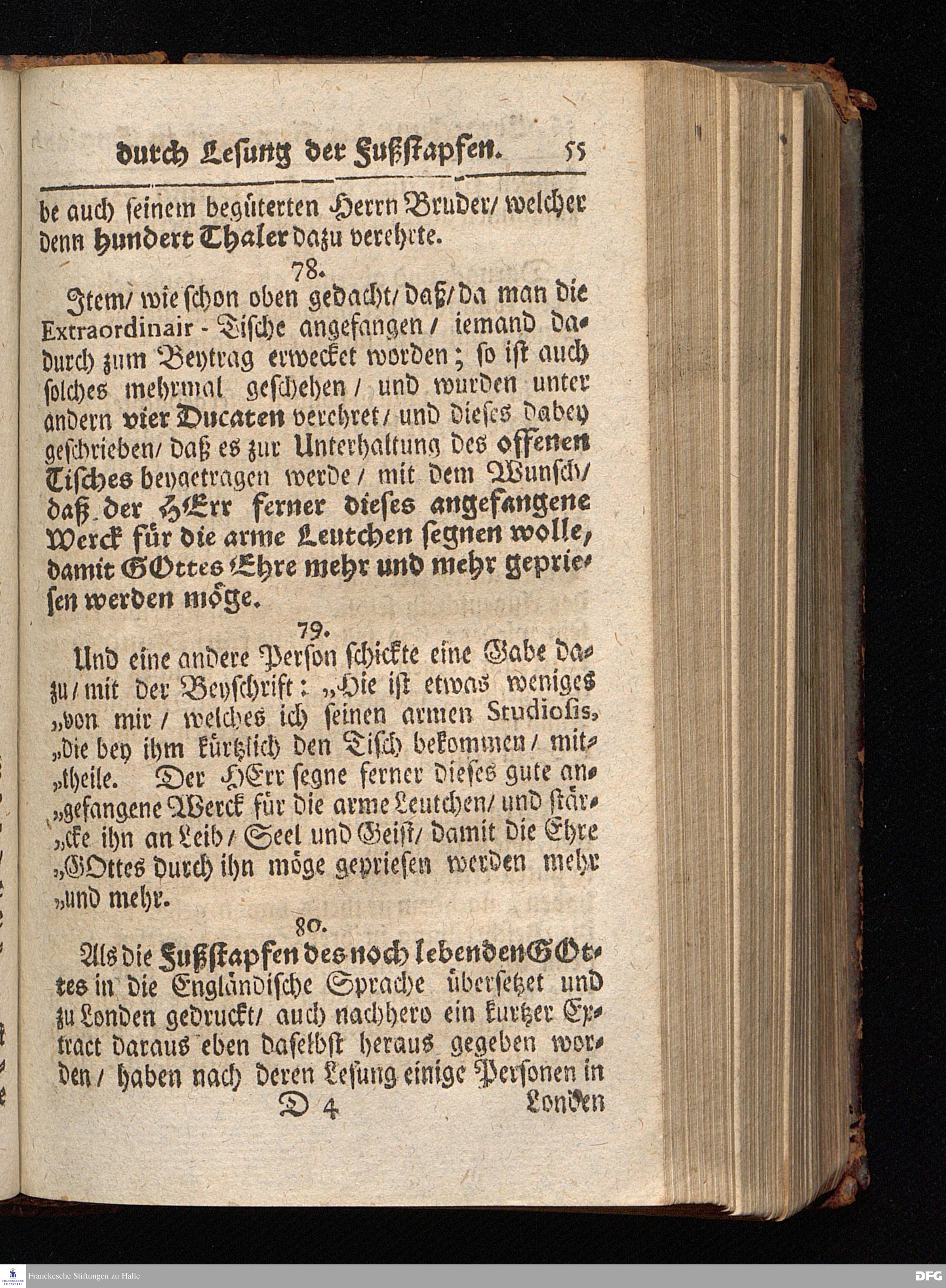 Segens=volle Fußstapfen des noch lebenden und waltenden liebrei=│chen und getreuen GOttes, Zur Beschämung des Unglaubens und Stärckung des Glaubens, entdecket durch eine wahrhafte und umständliche Nachricht von dem Wäysen=Hause und übrigen Anstalten zu Glaucha vor Halle; Welche Im Jahr 1701. zum Druck befördert, ietzo aber zum dritten mal ediret, und bis auf gegenwärtiges Jahr fortgesetzet von August Hermann Francken, S.Theol.Prof.und Past. HALLE, in Verlegung des Wäysen=Hauses, MDCCIX.