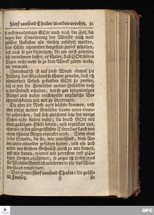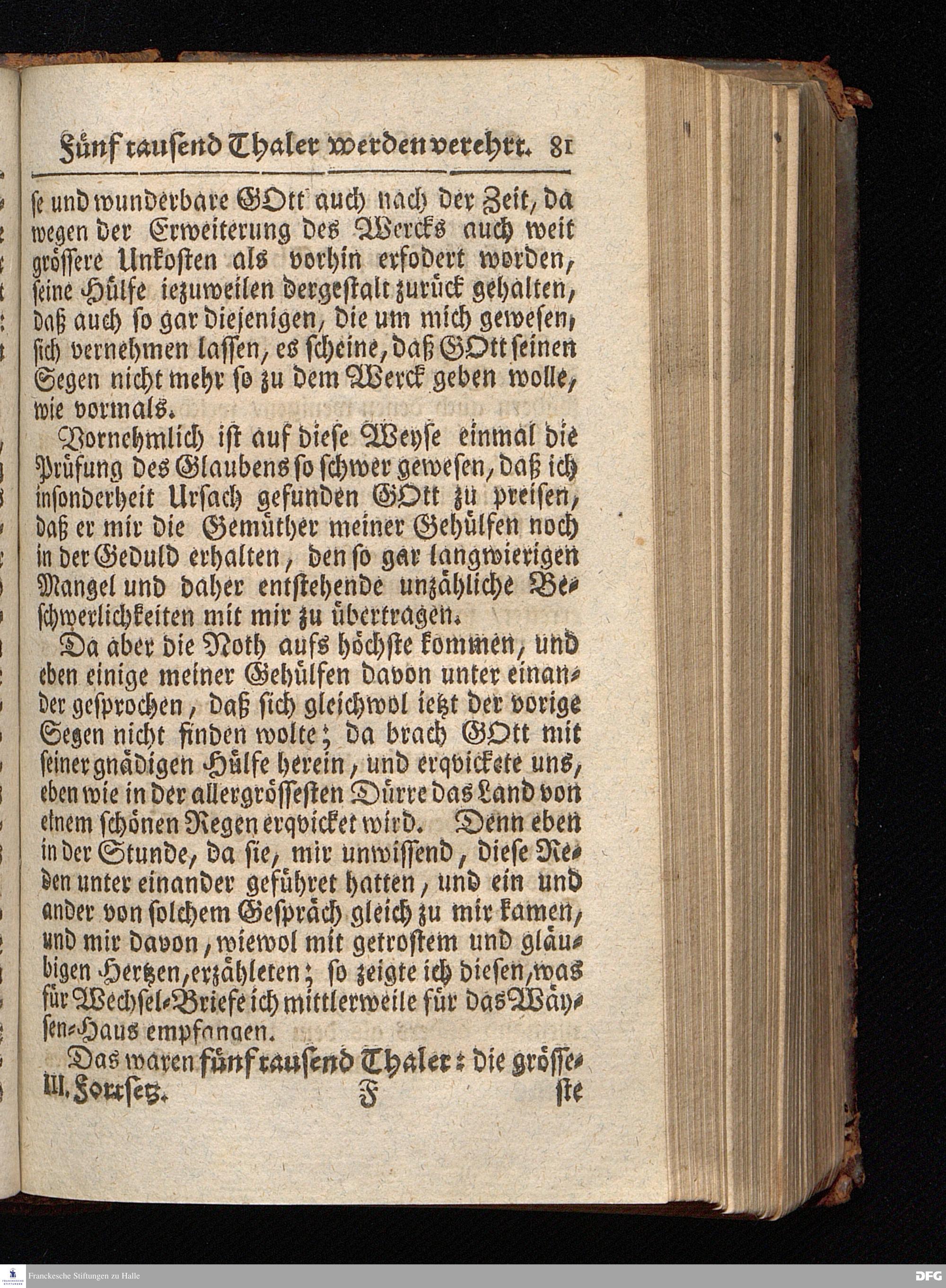 Segens=volle Fußstapfen des noch lebenden und waltenden liebrei=│chen und getreuen GOttes, Zur Beschämung des Unglaubens und Stärckung des Glaubens, entdecket durch eine wahrhafte und umständliche Nachricht von dem Wäysen=Hause und übrigen Anstalten zu Glaucha vor Halle; Welche Im Jahr 1701. zum Druck befördert, ietzo aber zum dritten mal ediret, und bis auf gegenwärtiges Jahr fortgesetzet von August Hermann Francken, S.Theol.Prof.und Past. HALLE, in Verlegung des Wäysen=Hauses, MDCCIX.