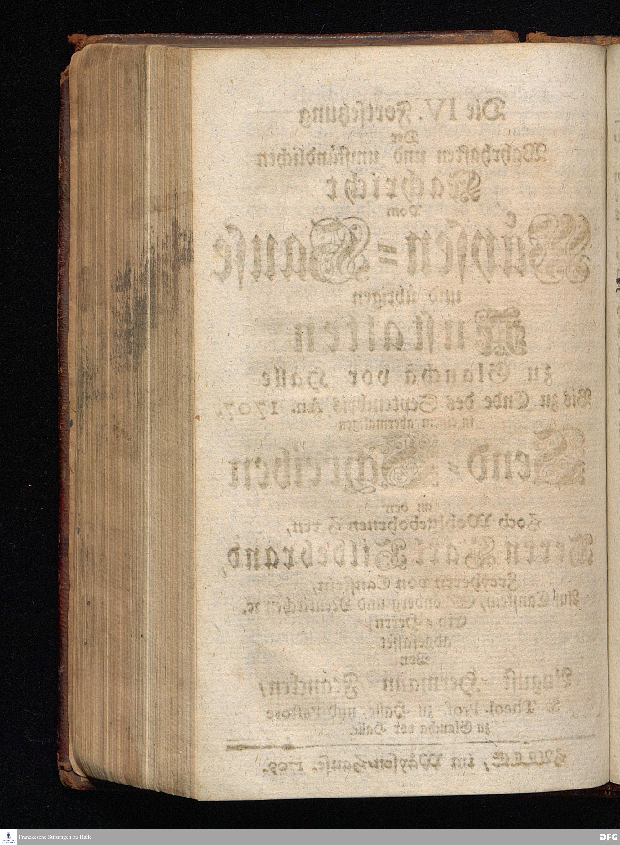 Segens=volle Fußstapfen des noch lebenden und waltenden liebrei=│chen und getreuen GOttes, Zur Beschämung des Unglaubens und Stärckung des Glaubens, entdecket durch eine wahrhafte und umständliche Nachricht von dem Wäysen=Hause und übrigen Anstalten zu Glaucha vor Halle; Welche Im Jahr 1701. zum Druck befördert, ietzo aber zum dritten mal ediret, und bis auf gegenwärtiges Jahr fortgesetzet von August Hermann Francken, S.Theol.Prof.und Past. HALLE, in Verlegung des Wäysen=Hauses, MDCCIX.