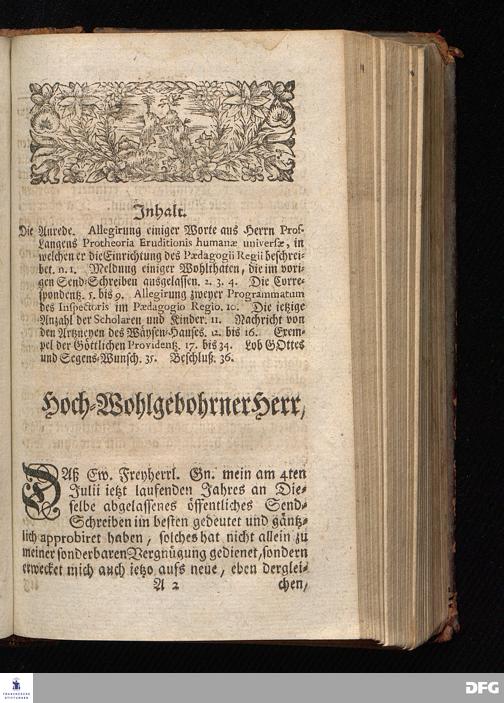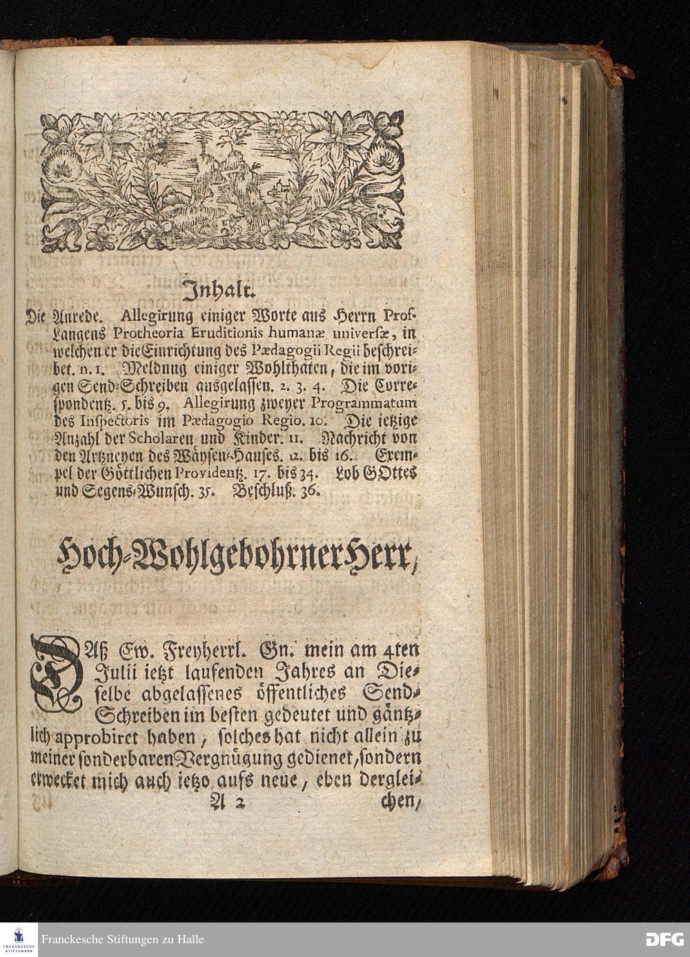 Segens=volle Fußstapfen des noch lebenden und waltenden liebrei=│chen und getreuen GOttes, Zur Beschämung des Unglaubens und Stärckung des Glaubens, entdecket durch eine wahrhafte und umständliche Nachricht von dem Wäysen=Hause und übrigen Anstalten zu Glaucha vor Halle; Welche Im Jahr 1701. zum Druck befördert, ietzo aber zum dritten mal ediret, und bis auf gegenwärtiges Jahr fortgesetzet von August Hermann Francken, S.Theol.Prof.und Past. HALLE, in Verlegung des Wäysen=Hauses, MDCCIX.
