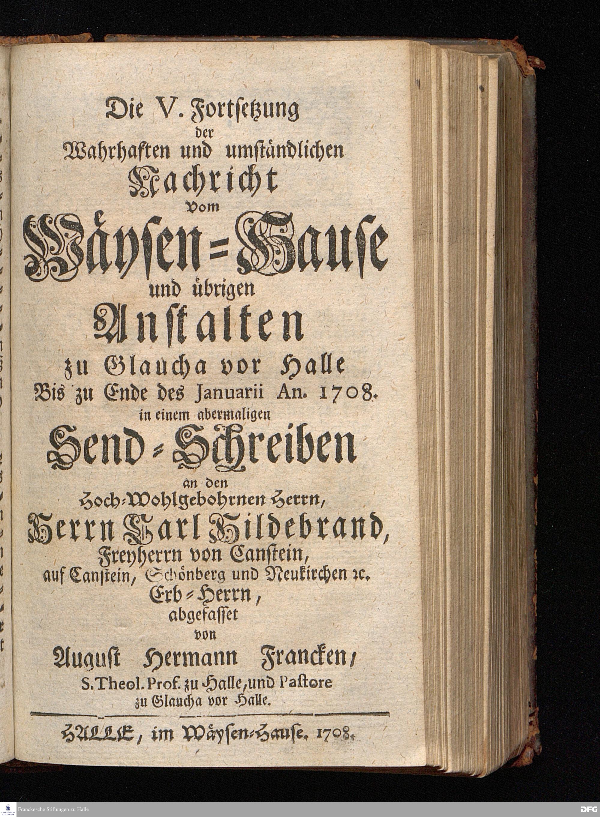 Segens=volle Fußstapfen des noch lebenden und waltenden liebrei=│chen und getreuen GOttes, Zur Beschämung des Unglaubens und Stärckung des Glaubens, entdecket durch eine wahrhafte und umständliche Nachricht von dem Wäysen=Hause und übrigen Anstalten zu Glaucha vor Halle; Welche Im Jahr 1701. zum Druck befördert, ietzo aber zum dritten mal ediret, und bis auf gegenwärtiges Jahr fortgesetzet von August Hermann Francken, S.Theol.Prof.und Past. HALLE, in Verlegung des Wäysen=Hauses, MDCCIX.