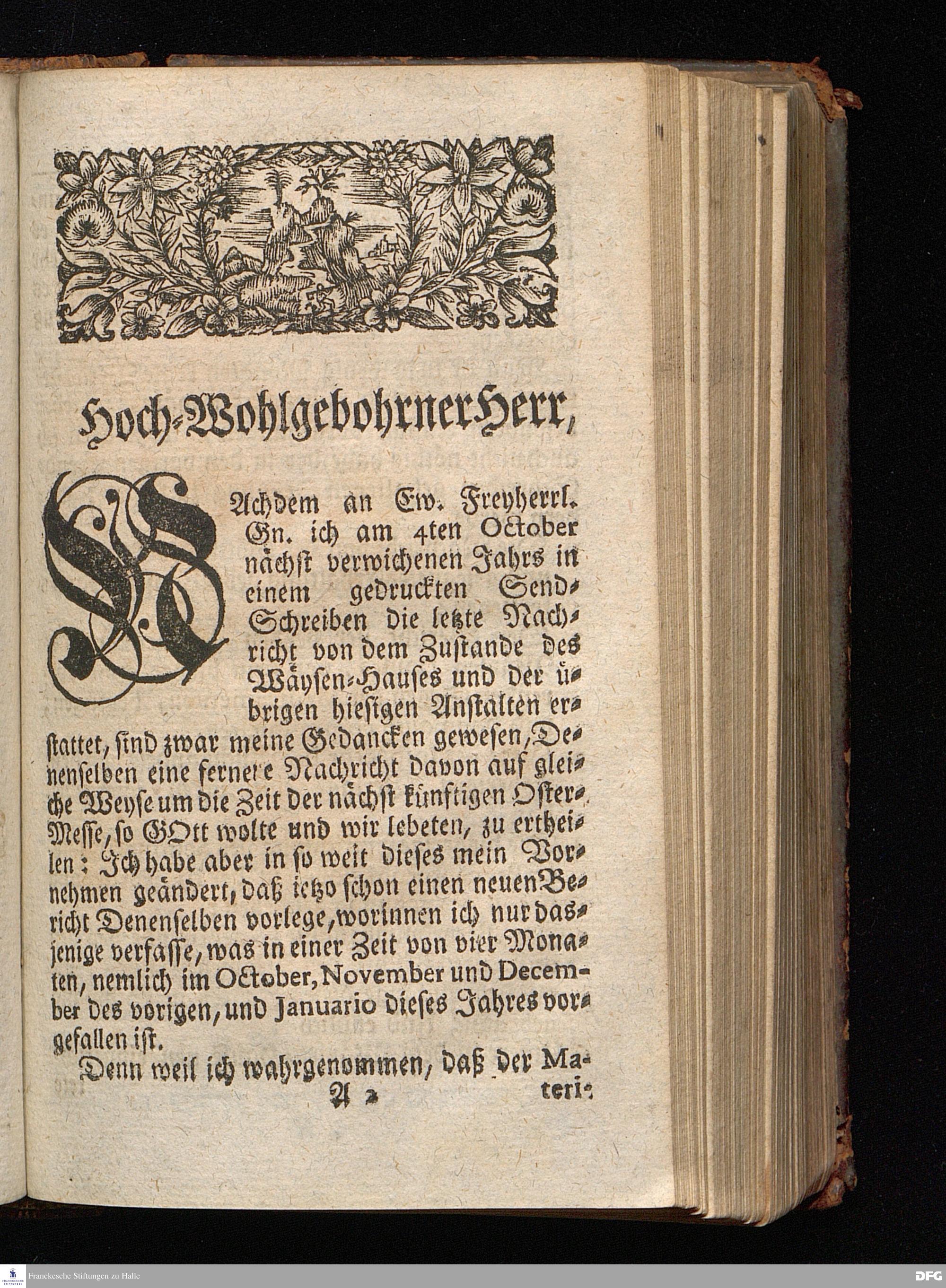 Segens=volle Fußstapfen des noch lebenden und waltenden liebrei=│chen und getreuen GOttes, Zur Beschämung des Unglaubens und Stärckung des Glaubens, entdecket durch eine wahrhafte und umständliche Nachricht von dem Wäysen=Hause und übrigen Anstalten zu Glaucha vor Halle; Welche Im Jahr 1701. zum Druck befördert, ietzo aber zum dritten mal ediret, und bis auf gegenwärtiges Jahr fortgesetzet von August Hermann Francken, S.Theol.Prof.und Past. HALLE, in Verlegung des Wäysen=Hauses, MDCCIX.