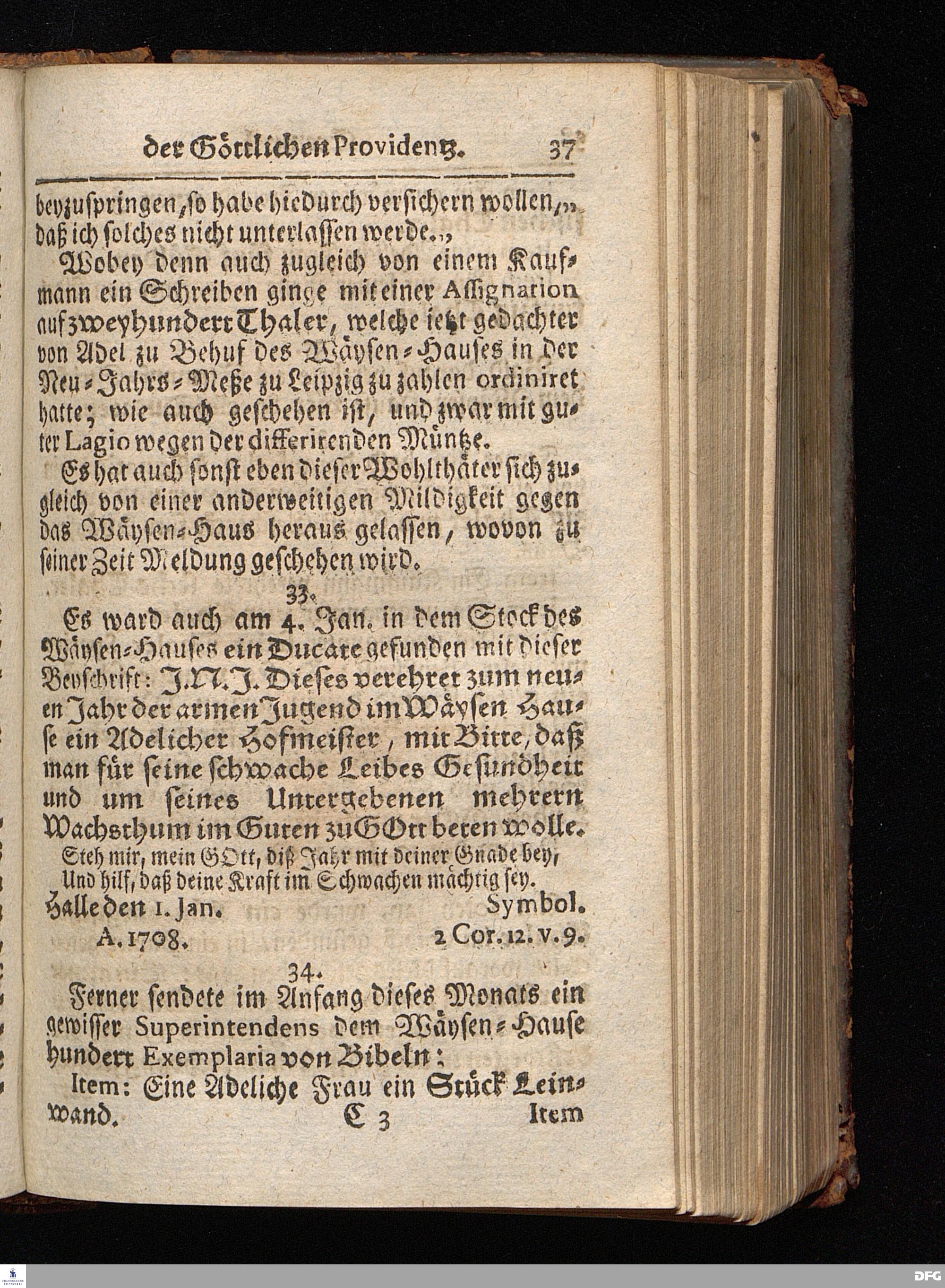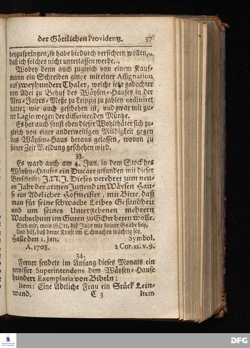 Segens=volle Fußstapfen des noch lebenden und waltenden liebrei=│chen und getreuen GOttes, Zur Beschämung des Unglaubens und Stärckung des Glaubens, entdecket durch eine wahrhafte und umständliche Nachricht von dem Wäysen=Hause und übrigen Anstalten zu Glaucha vor Halle; Welche Im Jahr 1701. zum Druck befördert, ietzo aber zum dritten mal ediret, und bis auf gegenwärtiges Jahr fortgesetzet von August Hermann Francken, S.Theol.Prof.und Past. HALLE, in Verlegung des Wäysen=Hauses, MDCCIX.