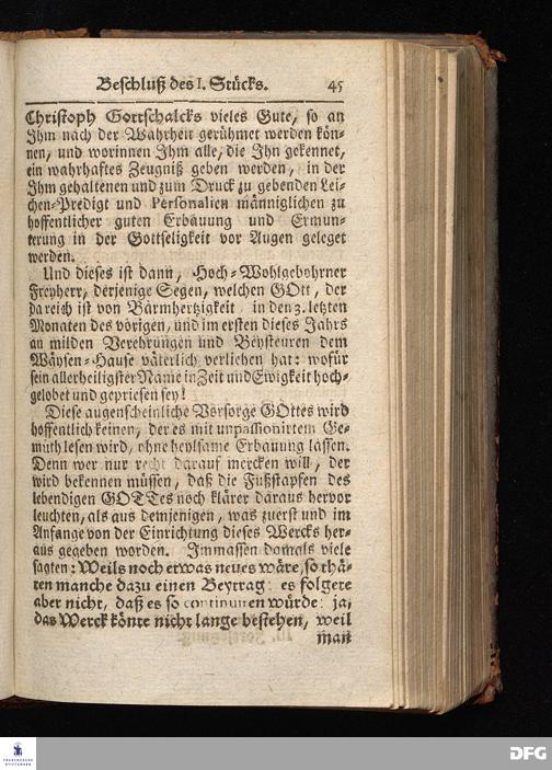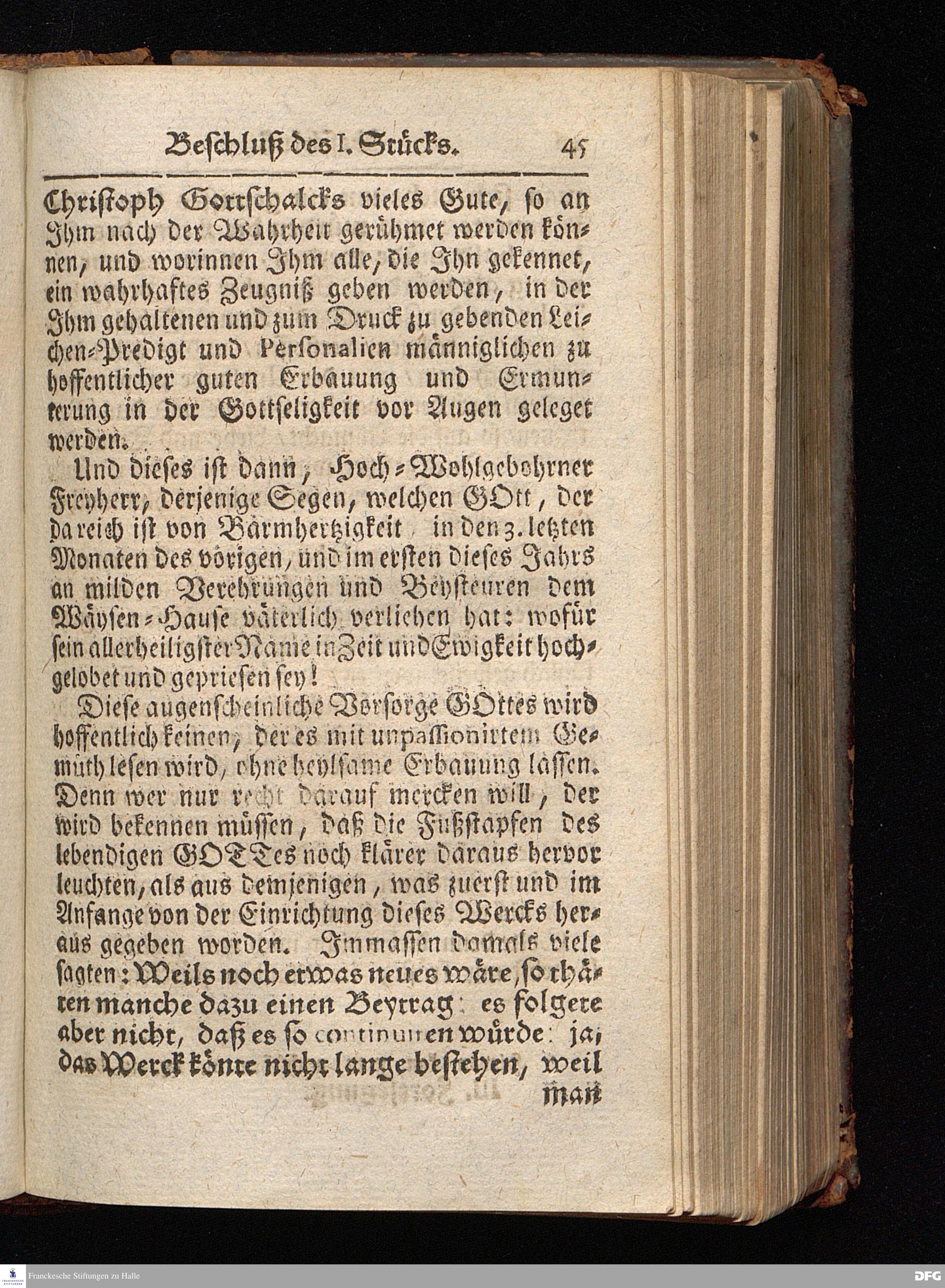 Segens=volle Fußstapfen des noch lebenden und waltenden liebrei=│chen und getreuen GOttes, Zur Beschämung des Unglaubens und Stärckung des Glaubens, entdecket durch eine wahrhafte und umständliche Nachricht von dem Wäysen=Hause und übrigen Anstalten zu Glaucha vor Halle; Welche Im Jahr 1701. zum Druck befördert, ietzo aber zum dritten mal ediret, und bis auf gegenwärtiges Jahr fortgesetzet von August Hermann Francken, S.Theol.Prof.und Past. HALLE, in Verlegung des Wäysen=Hauses, MDCCIX.