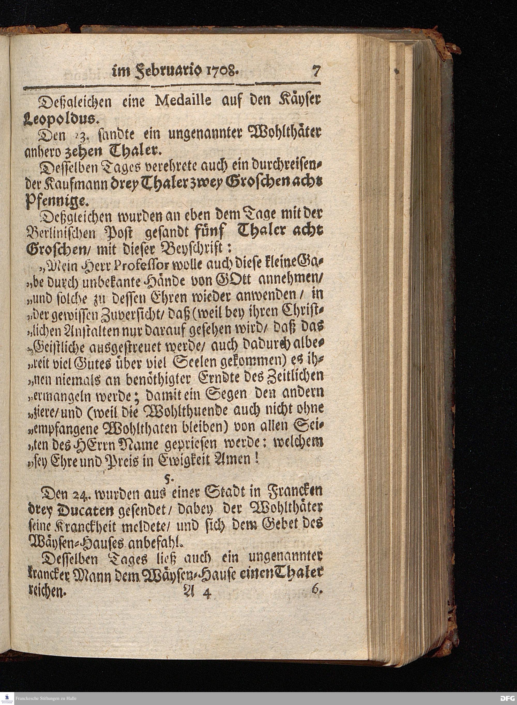 Segens=volle Fußstapfen des noch lebenden und waltenden liebrei=│chen und getreuen GOttes, Zur Beschämung des Unglaubens und Stärckung des Glaubens, entdecket durch eine wahrhafte und umständliche Nachricht von dem Wäysen=Hause und übrigen Anstalten zu Glaucha vor Halle; Welche Im Jahr 1701. zum Druck befördert, ietzo aber zum dritten mal ediret, und bis auf gegenwärtiges Jahr fortgesetzet von August Hermann Francken, S.Theol.Prof.und Past. HALLE, in Verlegung des Wäysen=Hauses, MDCCIX.