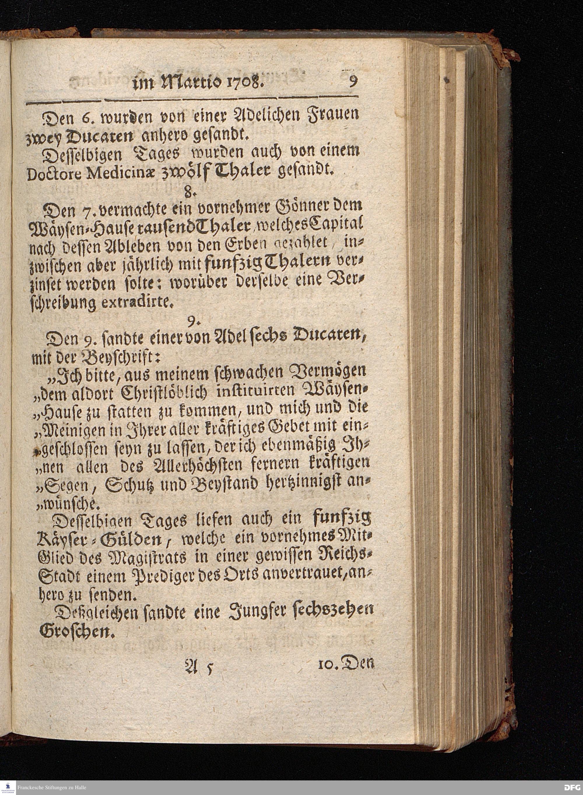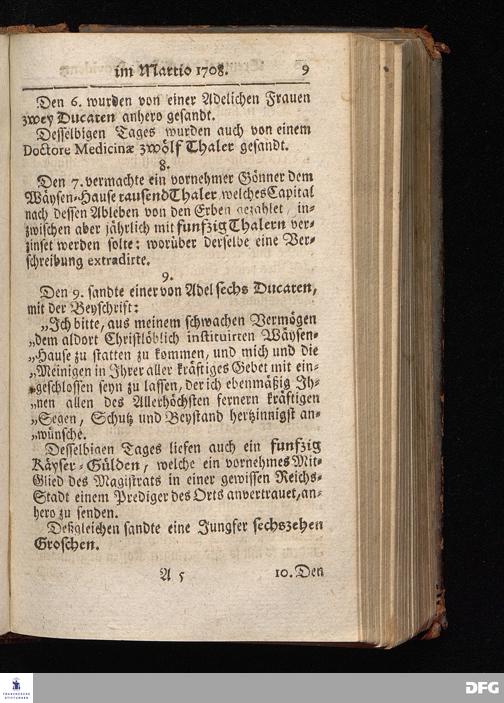 Segens=volle Fußstapfen des noch lebenden und waltenden liebrei=│chen und getreuen GOttes, Zur Beschämung des Unglaubens und Stärckung des Glaubens, entdecket durch eine wahrhafte und umständliche Nachricht von dem Wäysen=Hause und übrigen Anstalten zu Glaucha vor Halle; Welche Im Jahr 1701. zum Druck befördert, ietzo aber zum dritten mal ediret, und bis auf gegenwärtiges Jahr fortgesetzet von August Hermann Francken, S.Theol.Prof.und Past. HALLE, in Verlegung des Wäysen=Hauses, MDCCIX.