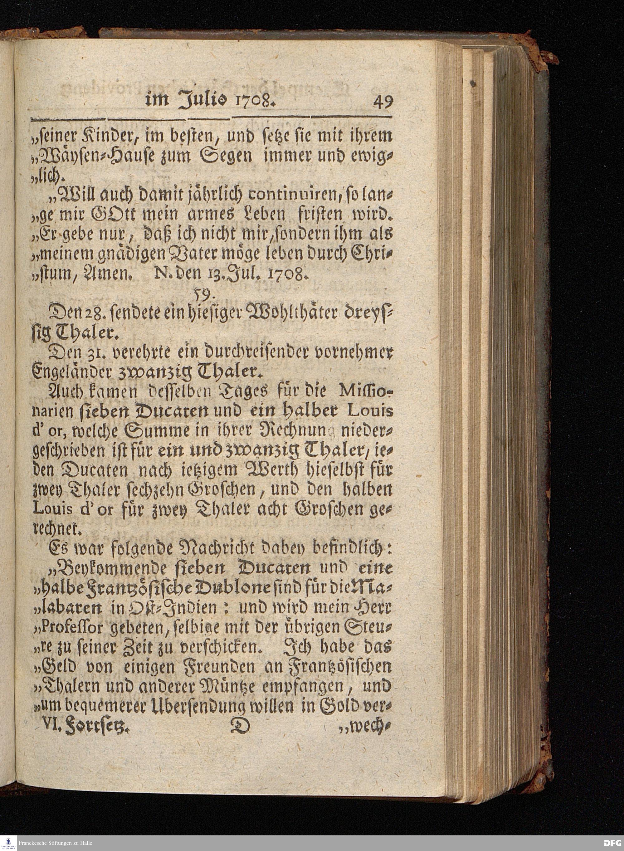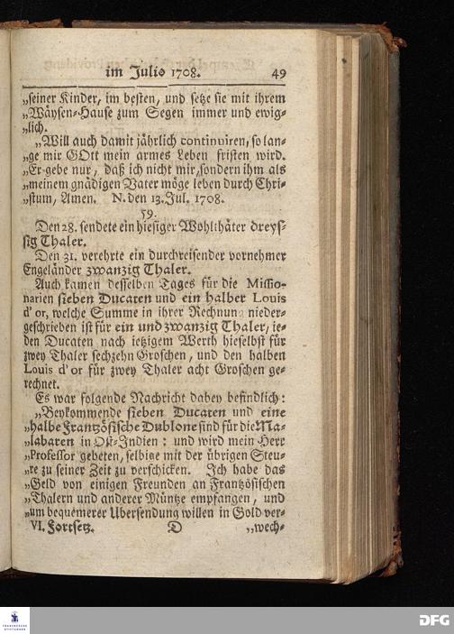 Segens=volle Fußstapfen des noch lebenden und waltenden liebrei=│chen und getreuen GOttes, Zur Beschämung des Unglaubens und Stärckung des Glaubens, entdecket durch eine wahrhafte und umständliche Nachricht von dem Wäysen=Hause und übrigen Anstalten zu Glaucha vor Halle; Welche Im Jahr 1701. zum Druck befördert, ietzo aber zum dritten mal ediret, und bis auf gegenwärtiges Jahr fortgesetzet von August Hermann Francken, S.Theol.Prof.und Past. HALLE, in Verlegung des Wäysen=Hauses, MDCCIX.