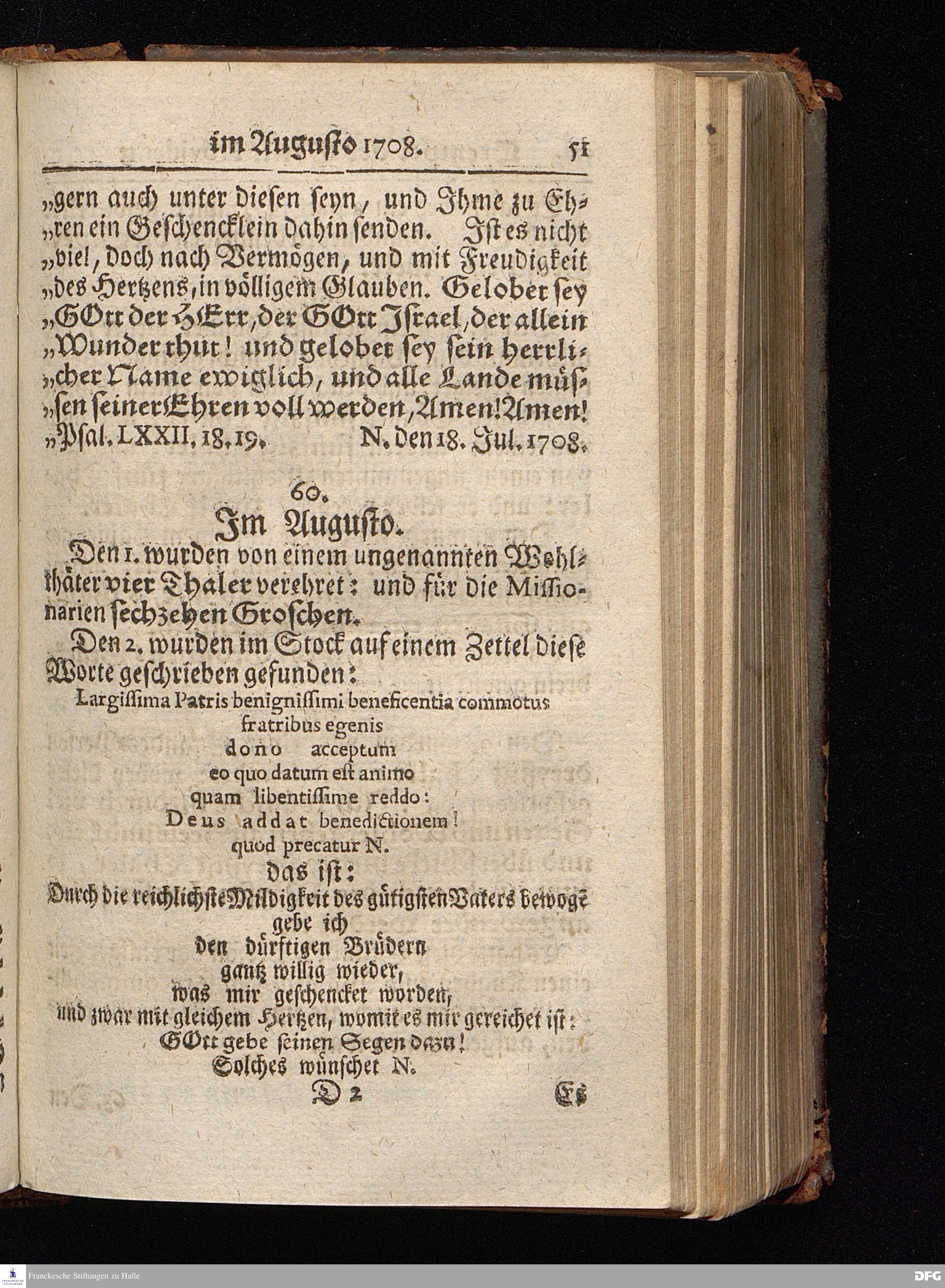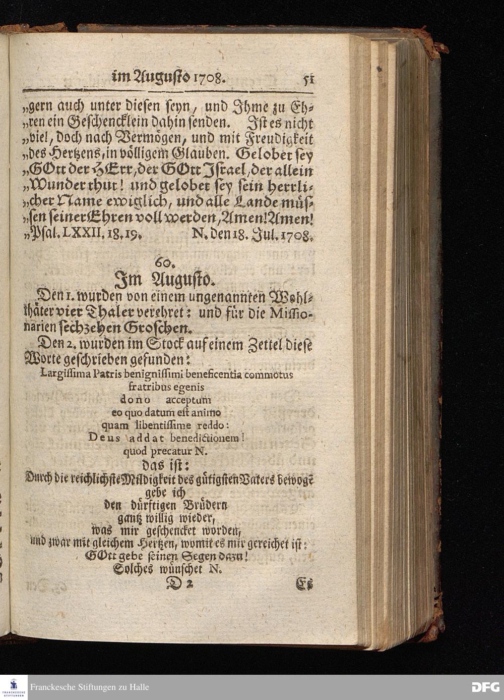 Segens=volle Fußstapfen des noch lebenden und waltenden liebrei=│chen und getreuen GOttes, Zur Beschämung des Unglaubens und Stärckung des Glaubens, entdecket durch eine wahrhafte und umständliche Nachricht von dem Wäysen=Hause und übrigen Anstalten zu Glaucha vor Halle; Welche Im Jahr 1701. zum Druck befördert, ietzo aber zum dritten mal ediret, und bis auf gegenwärtiges Jahr fortgesetzet von August Hermann Francken, S.Theol.Prof.und Past. HALLE, in Verlegung des Wäysen=Hauses, MDCCIX.