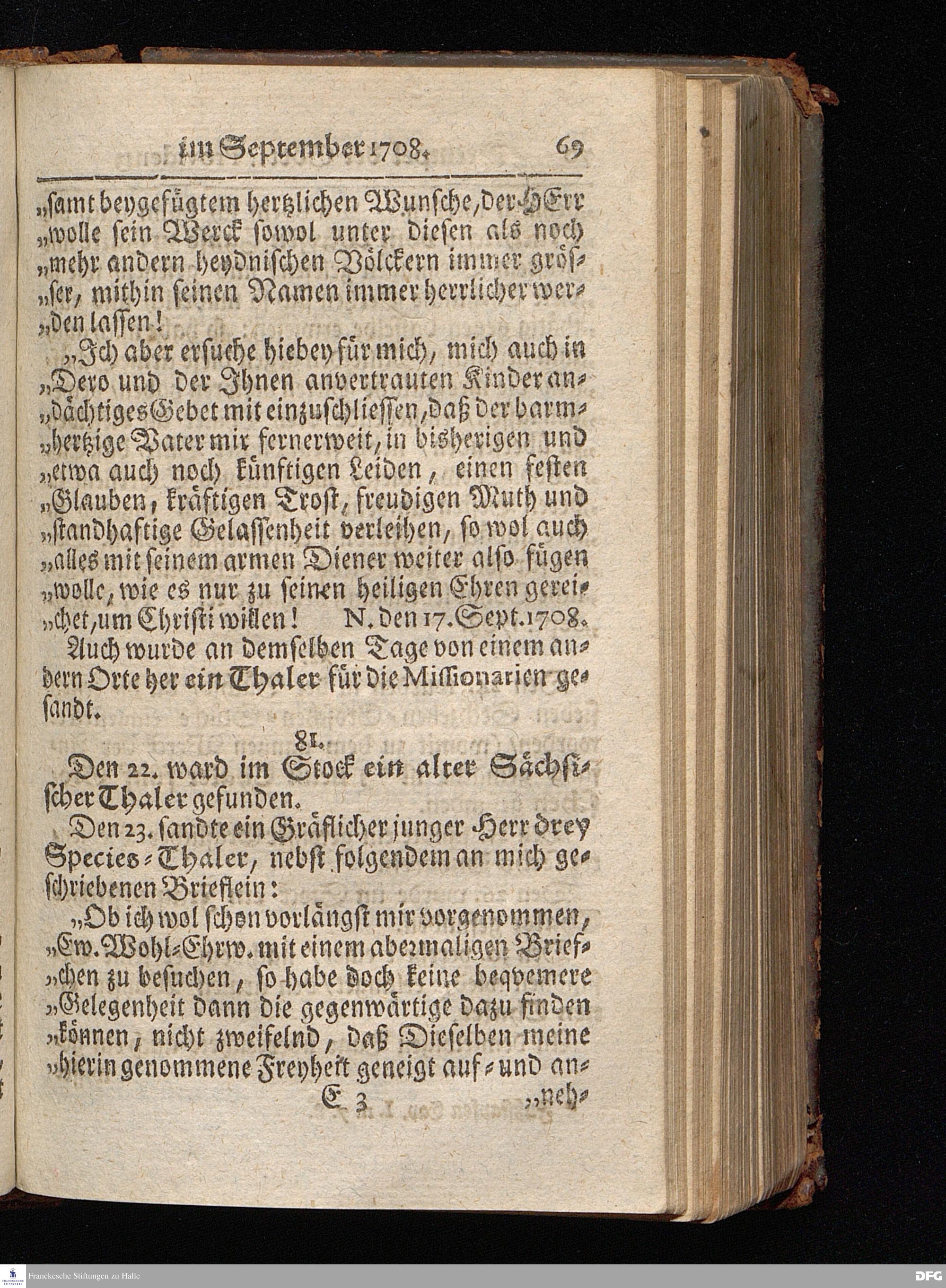 Segens=volle Fußstapfen des noch lebenden und waltenden liebrei=│chen und getreuen GOttes, Zur Beschämung des Unglaubens und Stärckung des Glaubens, entdecket durch eine wahrhafte und umständliche Nachricht von dem Wäysen=Hause und übrigen Anstalten zu Glaucha vor Halle; Welche Im Jahr 1701. zum Druck befördert, ietzo aber zum dritten mal ediret, und bis auf gegenwärtiges Jahr fortgesetzet von August Hermann Francken, S.Theol.Prof.und Past. HALLE, in Verlegung des Wäysen=Hauses, MDCCIX.