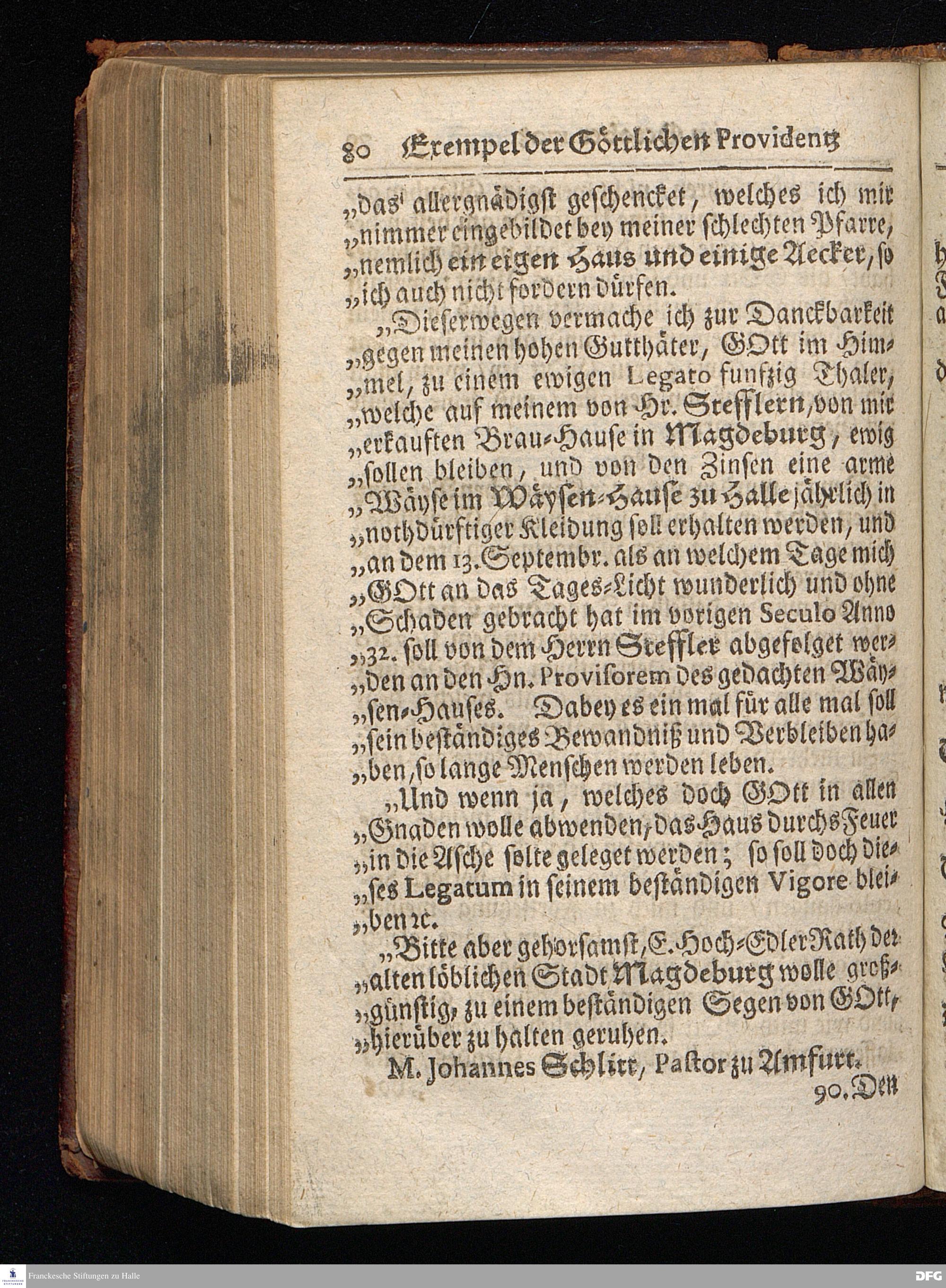 Segens=volle Fußstapfen des noch lebenden und waltenden liebrei=│chen und getreuen GOttes, Zur Beschämung des Unglaubens und Stärckung des Glaubens, entdecket durch eine wahrhafte und umständliche Nachricht von dem Wäysen=Hause und übrigen Anstalten zu Glaucha vor Halle; Welche Im Jahr 1701. zum Druck befördert, ietzo aber zum dritten mal ediret, und bis auf gegenwärtiges Jahr fortgesetzet von August Hermann Francken, S.Theol.Prof.und Past. HALLE, in Verlegung des Wäysen=Hauses, MDCCIX.
