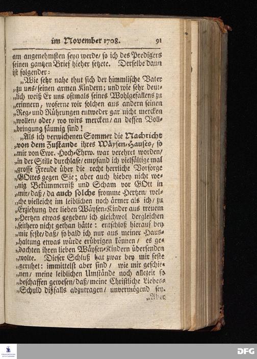 Segens=volle Fußstapfen des noch lebenden und waltenden liebrei=│chen und getreuen GOttes, Zur Beschämung des Unglaubens und Stärckung des Glaubens, entdecket durch eine wahrhafte und umständliche Nachricht von dem Wäysen=Hause und übrigen Anstalten zu Glaucha vor Halle; Welche Im Jahr 1701. zum Druck befördert, ietzo aber zum dritten mal ediret, und bis auf gegenwärtiges Jahr fortgesetzet von August Hermann Francken, S.Theol.Prof.und Past. HALLE, in Verlegung des Wäysen=Hauses, MDCCIX.