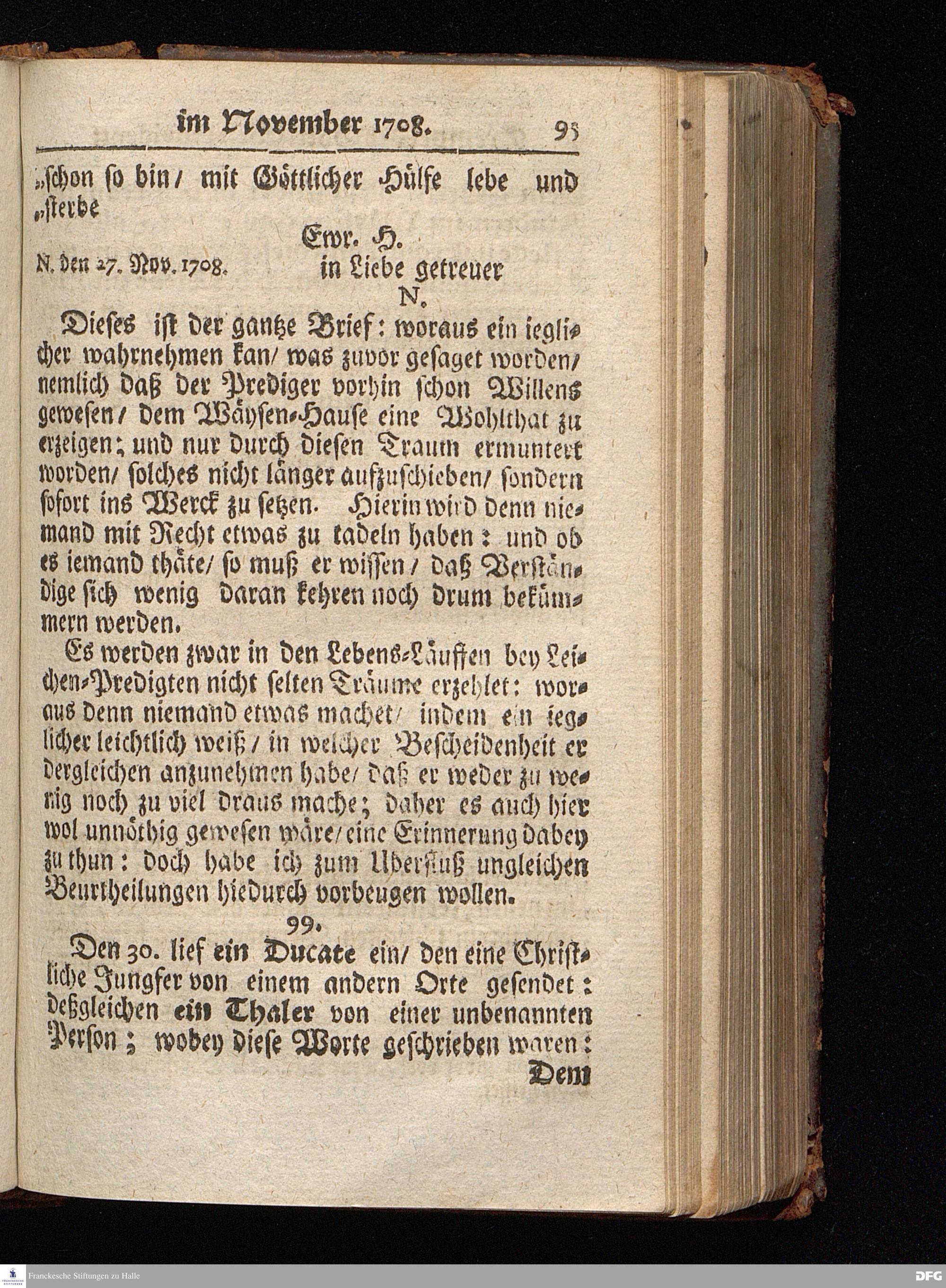 Segens=volle Fußstapfen des noch lebenden und waltenden liebrei=│chen und getreuen GOttes, Zur Beschämung des Unglaubens und Stärckung des Glaubens, entdecket durch eine wahrhafte und umständliche Nachricht von dem Wäysen=Hause und übrigen Anstalten zu Glaucha vor Halle; Welche Im Jahr 1701. zum Druck befördert, ietzo aber zum dritten mal ediret, und bis auf gegenwärtiges Jahr fortgesetzet von August Hermann Francken, S.Theol.Prof.und Past. HALLE, in Verlegung des Wäysen=Hauses, MDCCIX.