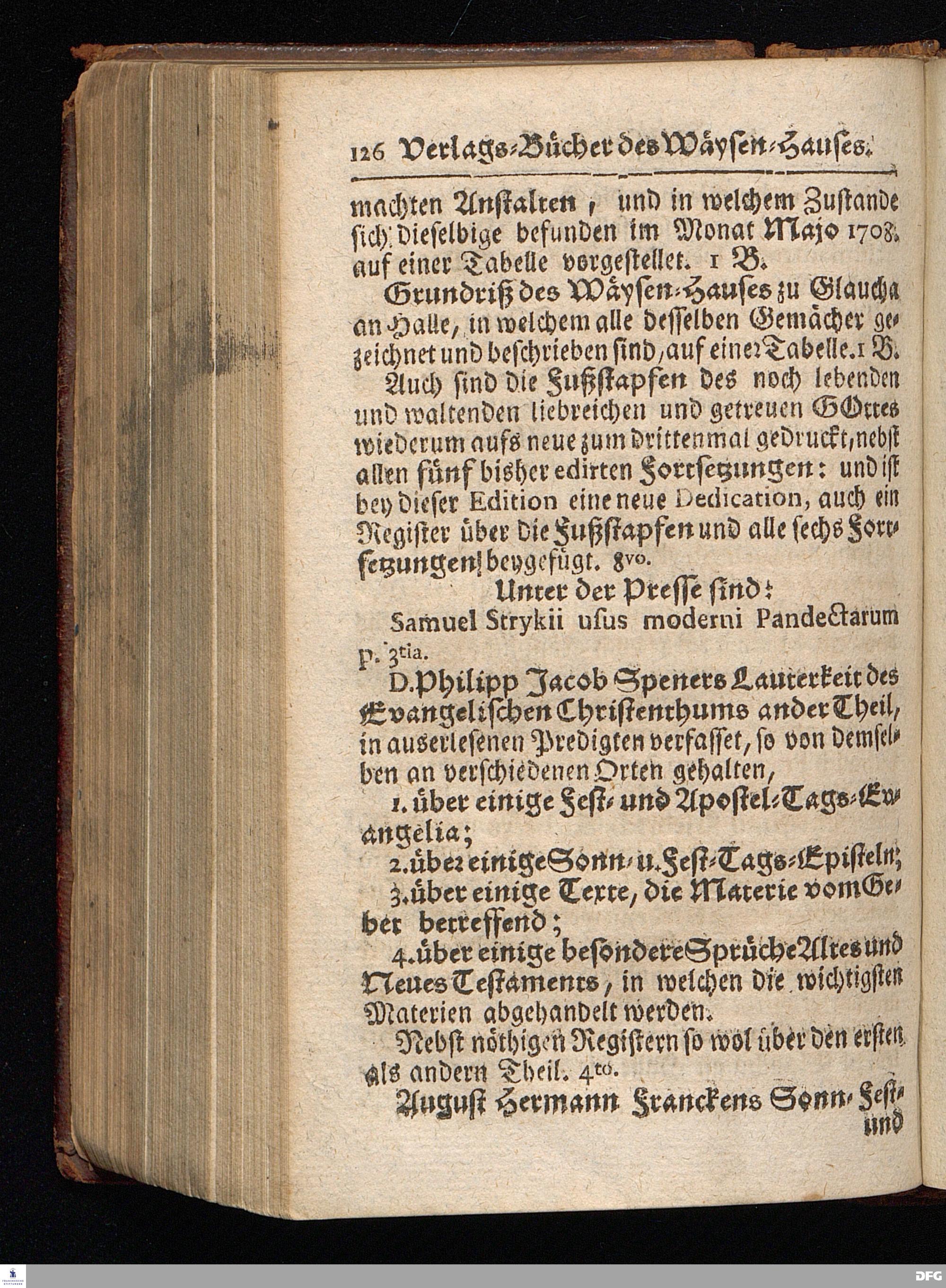 Segens=volle Fußstapfen des noch lebenden und waltenden liebrei=│chen und getreuen GOttes, Zur Beschämung des Unglaubens und Stärckung des Glaubens, entdecket durch eine wahrhafte und umständliche Nachricht von dem Wäysen=Hause und übrigen Anstalten zu Glaucha vor Halle; Welche Im Jahr 1701. zum Druck befördert, ietzo aber zum dritten mal ediret, und bis auf gegenwärtiges Jahr fortgesetzet von August Hermann Francken, S.Theol.Prof.und Past. HALLE, in Verlegung des Wäysen=Hauses, MDCCIX.