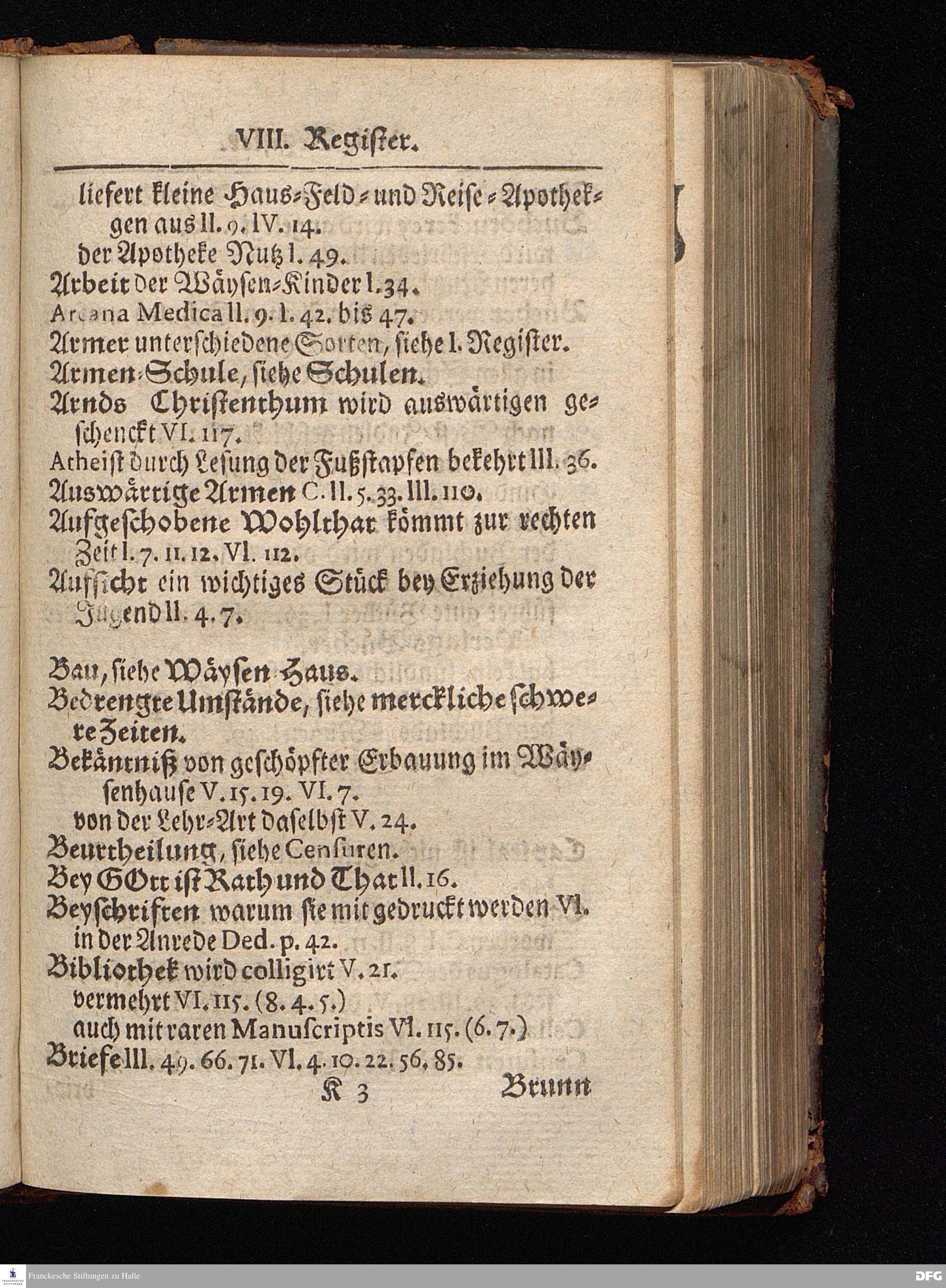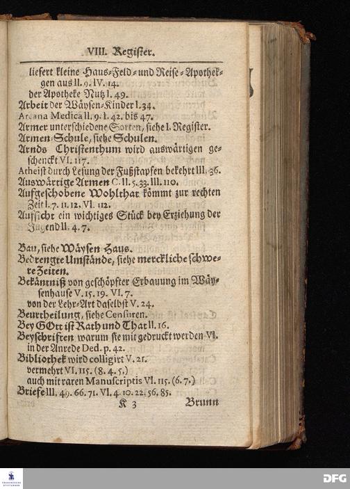 Segens=volle Fußstapfen des noch lebenden und waltenden liebrei=│chen und getreuen GOttes, Zur Beschämung des Unglaubens und Stärckung des Glaubens, entdecket durch eine wahrhafte und umständliche Nachricht von dem Wäysen=Hause und übrigen Anstalten zu Glaucha vor Halle; Welche Im Jahr 1701. zum Druck befördert, ietzo aber zum dritten mal ediret, und bis auf gegenwärtiges Jahr fortgesetzet von August Hermann Francken, S.Theol.Prof.und Past. HALLE, in Verlegung des Wäysen=Hauses, MDCCIX.