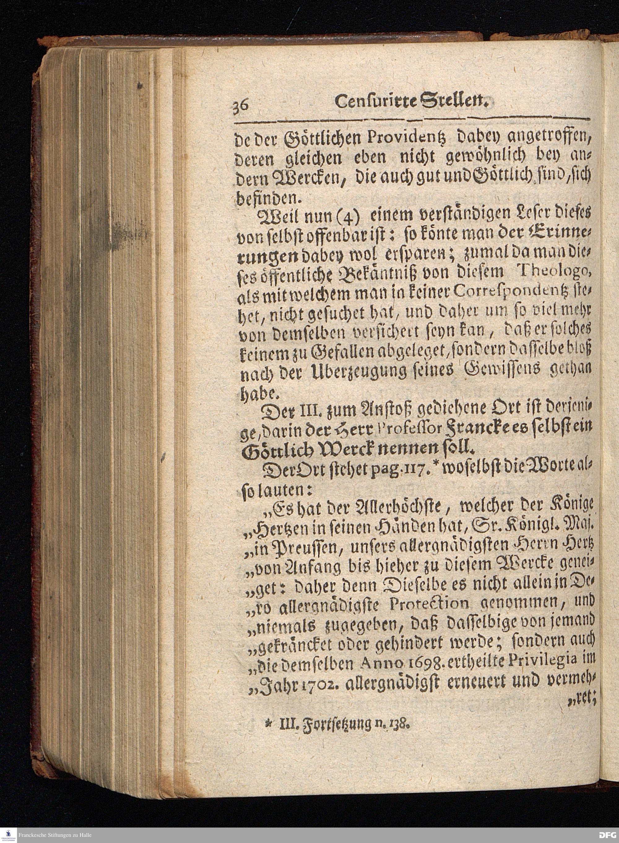 Segens=volle Fußstapfen des noch lebenden und waltenden liebrei=│chen und getreuen GOttes, Zur Beschämung des Unglaubens und Stärckung des Glaubens, entdecket durch eine wahrhafte und umständliche Nachricht von dem Wäysen=Hause und übrigen Anstalten zu Glaucha vor Halle; Welche Im Jahr 1701. zum Druck befördert, ietzo aber zum dritten mal ediret, und bis auf gegenwärtiges Jahr fortgesetzet von August Hermann Francken, S.Theol.Prof.und Past. HALLE, in Verlegung des Wäysen=Hauses, MDCCIX.