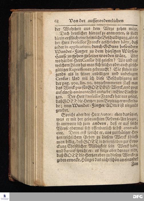 Segens=volle Fußstapfen des noch lebenden und waltenden liebrei=│chen und getreuen GOttes, Zur Beschämung des Unglaubens und Stärckung des Glaubens, entdecket durch eine wahrhafte und umständliche Nachricht von dem Wäysen=Hause und übrigen Anstalten zu Glaucha vor Halle; Welche Im Jahr 1701. zum Druck befördert, ietzo aber zum dritten mal ediret, und bis auf gegenwärtiges Jahr fortgesetzet von August Hermann Francken, S.Theol.Prof.und Past. HALLE, in Verlegung des Wäysen=Hauses, MDCCIX.
