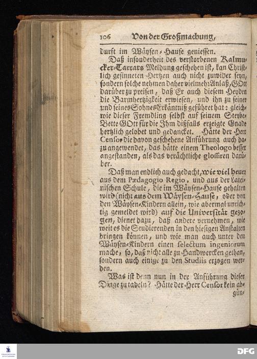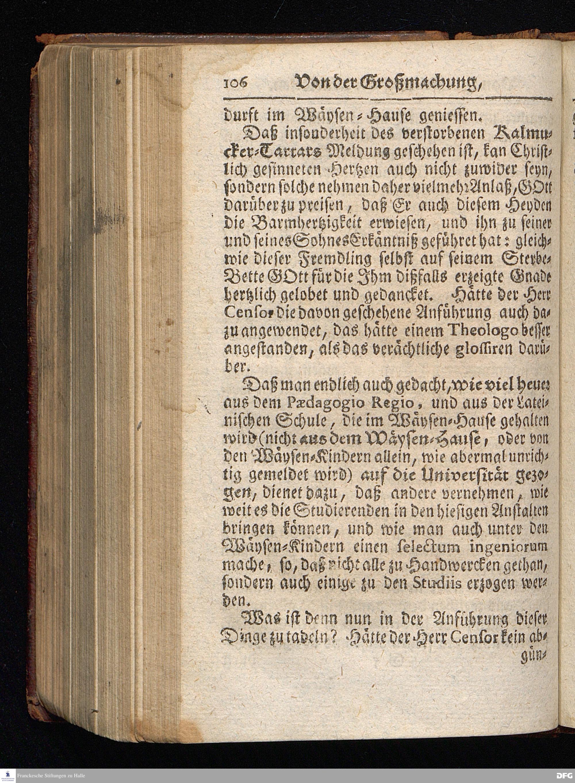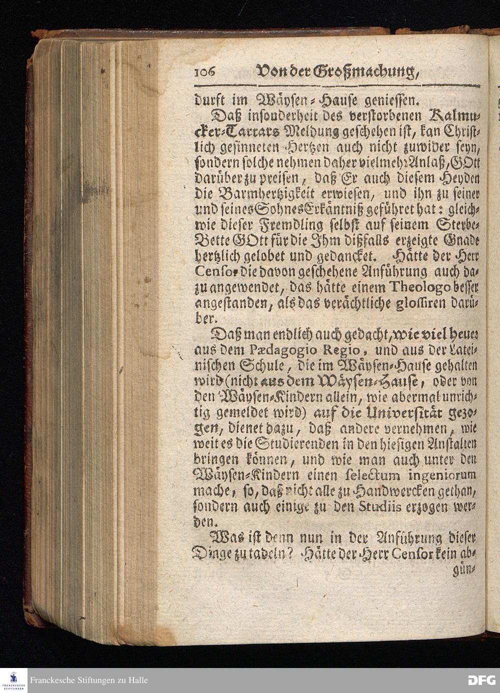 Segens=volle Fußstapfen des noch lebenden und waltenden liebrei=│chen und getreuen GOttes, Zur Beschämung des Unglaubens und Stärckung des Glaubens, entdecket durch eine wahrhafte und umständliche Nachricht von dem Wäysen=Hause und übrigen Anstalten zu Glaucha vor Halle; Welche Im Jahr 1701. zum Druck befördert, ietzo aber zum dritten mal ediret, und bis auf gegenwärtiges Jahr fortgesetzet von August Hermann Francken, S.Theol.Prof.und Past. HALLE, in Verlegung des Wäysen=Hauses, MDCCIX.