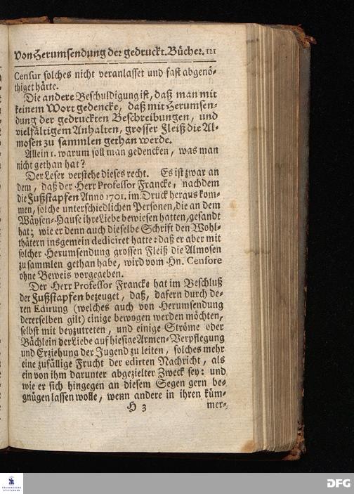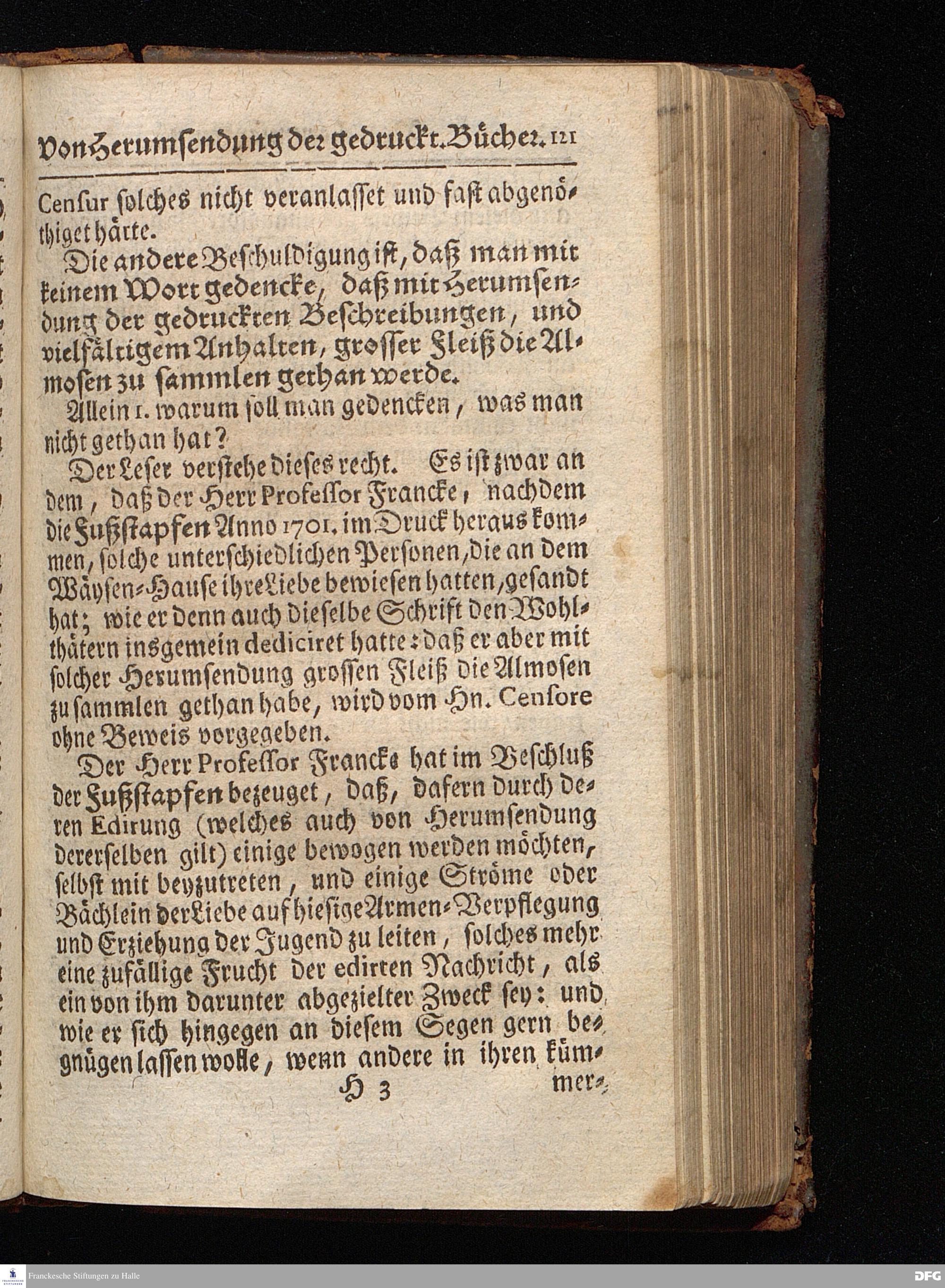 Segens=volle Fußstapfen des noch lebenden und waltenden liebrei=│chen und getreuen GOttes, Zur Beschämung des Unglaubens und Stärckung des Glaubens, entdecket durch eine wahrhafte und umständliche Nachricht von dem Wäysen=Hause und übrigen Anstalten zu Glaucha vor Halle; Welche Im Jahr 1701. zum Druck befördert, ietzo aber zum dritten mal ediret, und bis auf gegenwärtiges Jahr fortgesetzet von August Hermann Francken, S.Theol.Prof.und Past. HALLE, in Verlegung des Wäysen=Hauses, MDCCIX.