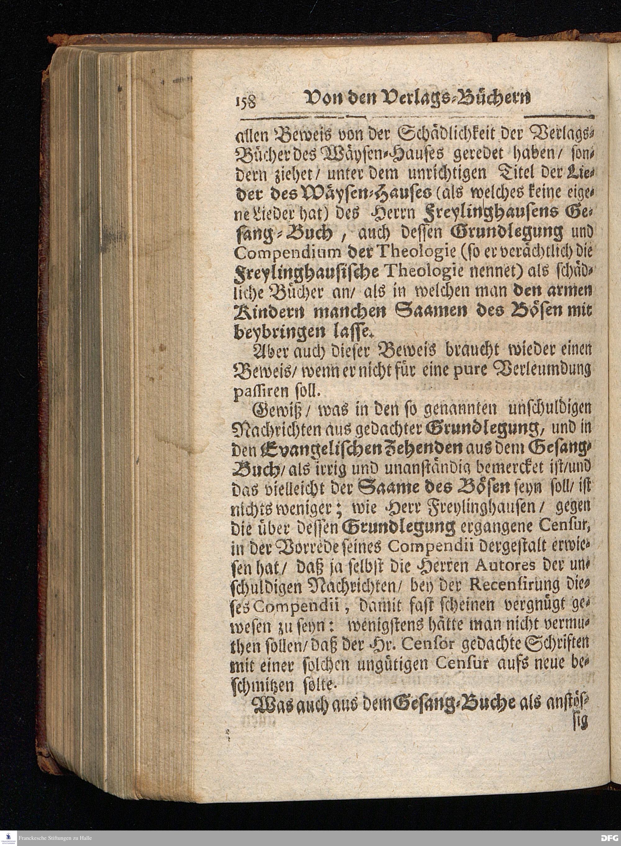 Segens=volle Fußstapfen des noch lebenden und waltenden liebrei=│chen und getreuen GOttes, Zur Beschämung des Unglaubens und Stärckung des Glaubens, entdecket durch eine wahrhafte und umständliche Nachricht von dem Wäysen=Hause und übrigen Anstalten zu Glaucha vor Halle; Welche Im Jahr 1701. zum Druck befördert, ietzo aber zum dritten mal ediret, und bis auf gegenwärtiges Jahr fortgesetzet von August Hermann Francken, S.Theol.Prof.und Past. HALLE, in Verlegung des Wäysen=Hauses, MDCCIX.