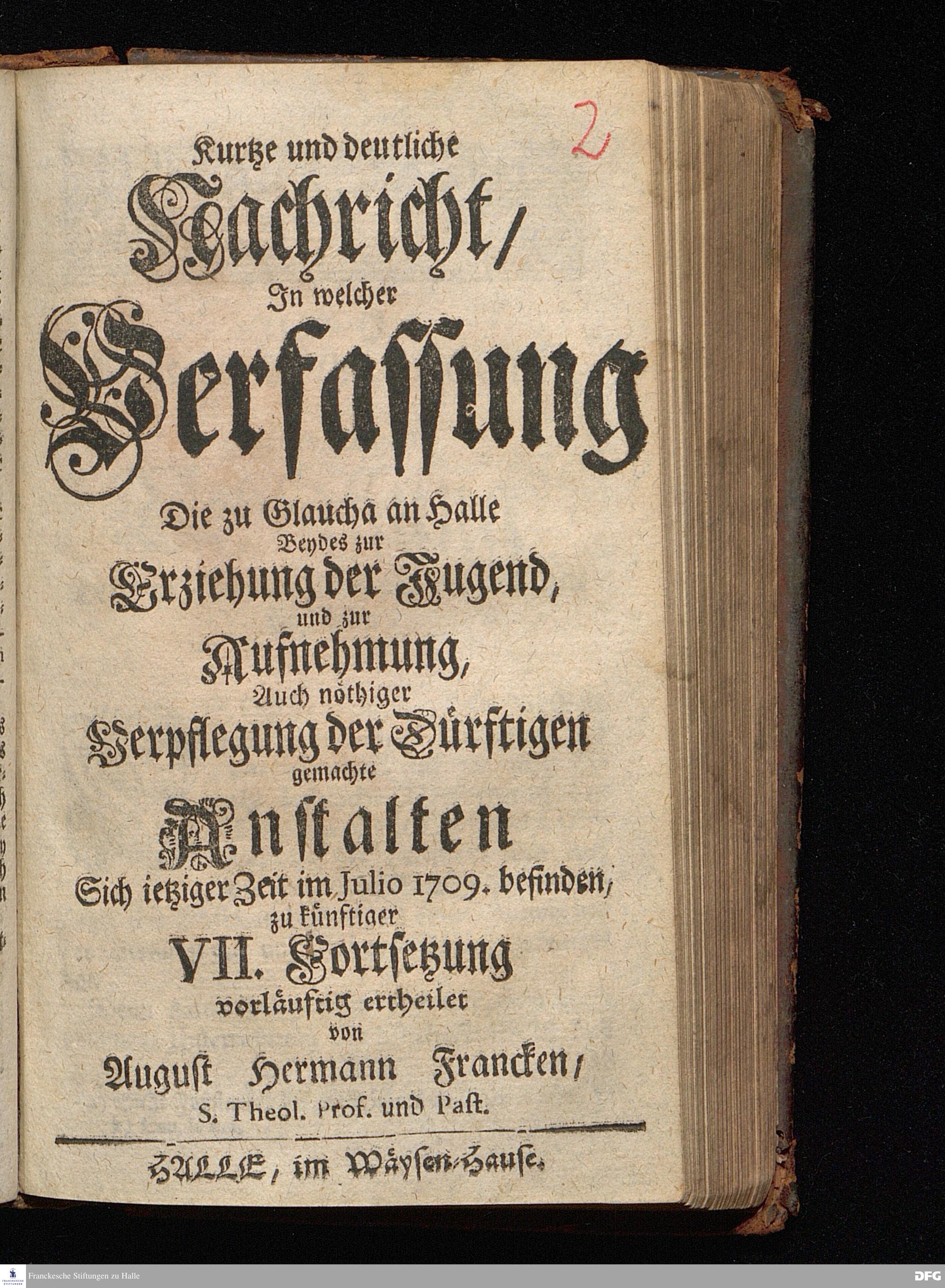 Segens=volle Fußstapfen des noch lebenden und waltenden liebrei=│chen und getreuen GOttes, Zur Beschämung des Unglaubens und Stärckung des Glaubens, entdecket durch eine wahrhafte und umständliche Nachricht von dem Wäysen=Hause und übrigen Anstalten zu Glaucha vor Halle; Welche Im Jahr 1701. zum Druck befördert, ietzo aber zum dritten mal ediret, und bis auf gegenwärtiges Jahr fortgesetzet von August Hermann Francken, S.Theol.Prof.und Past. HALLE, in Verlegung des Wäysen=Hauses, MDCCIX.