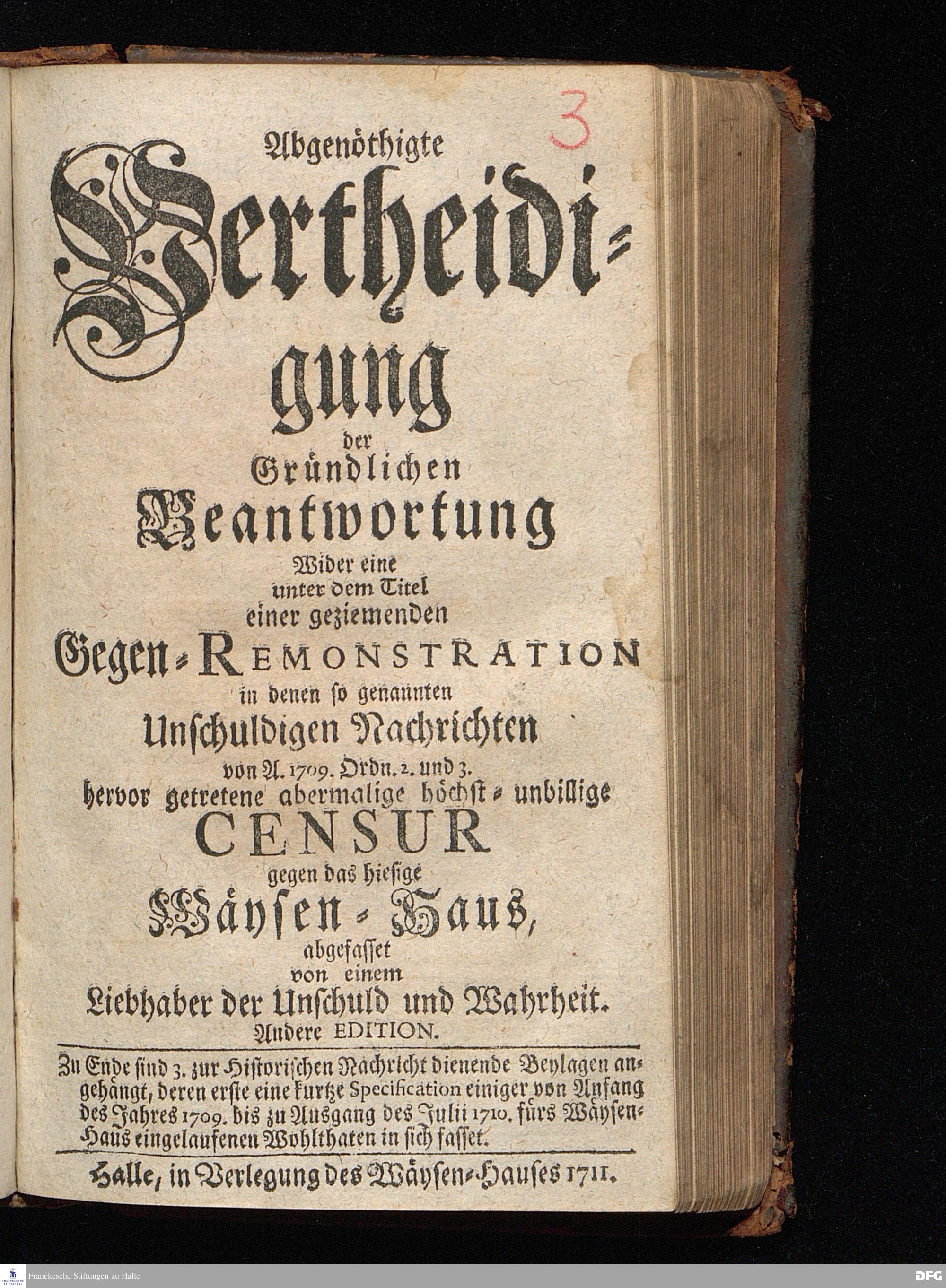 Segens=volle Fußstapfen des noch lebenden und waltenden liebrei=│chen und getreuen GOttes, Zur Beschämung des Unglaubens und Stärckung des Glaubens, entdecket durch eine wahrhafte und umständliche Nachricht von dem Wäysen=Hause und übrigen Anstalten zu Glaucha vor Halle; Welche Im Jahr 1701. zum Druck befördert, ietzo aber zum dritten mal ediret, und bis auf gegenwärtiges Jahr fortgesetzet von August Hermann Francken, S.Theol.Prof.und Past. HALLE, in Verlegung des Wäysen=Hauses, MDCCIX.
