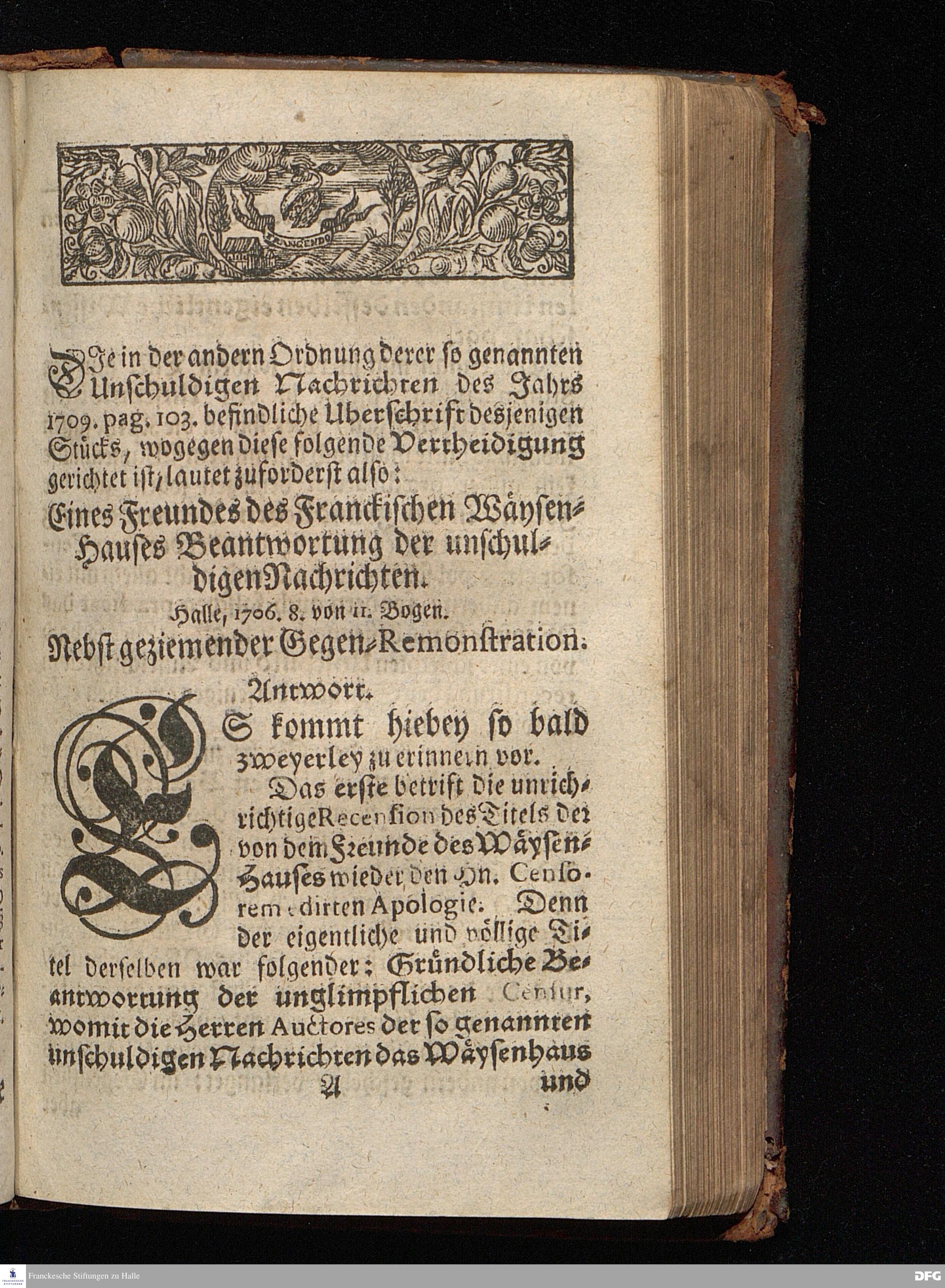 Segens=volle Fußstapfen des noch lebenden und waltenden liebrei=│chen und getreuen GOttes, Zur Beschämung des Unglaubens und Stärckung des Glaubens, entdecket durch eine wahrhafte und umständliche Nachricht von dem Wäysen=Hause und übrigen Anstalten zu Glaucha vor Halle; Welche Im Jahr 1701. zum Druck befördert, ietzo aber zum dritten mal ediret, und bis auf gegenwärtiges Jahr fortgesetzet von August Hermann Francken, S.Theol.Prof.und Past. HALLE, in Verlegung des Wäysen=Hauses, MDCCIX.