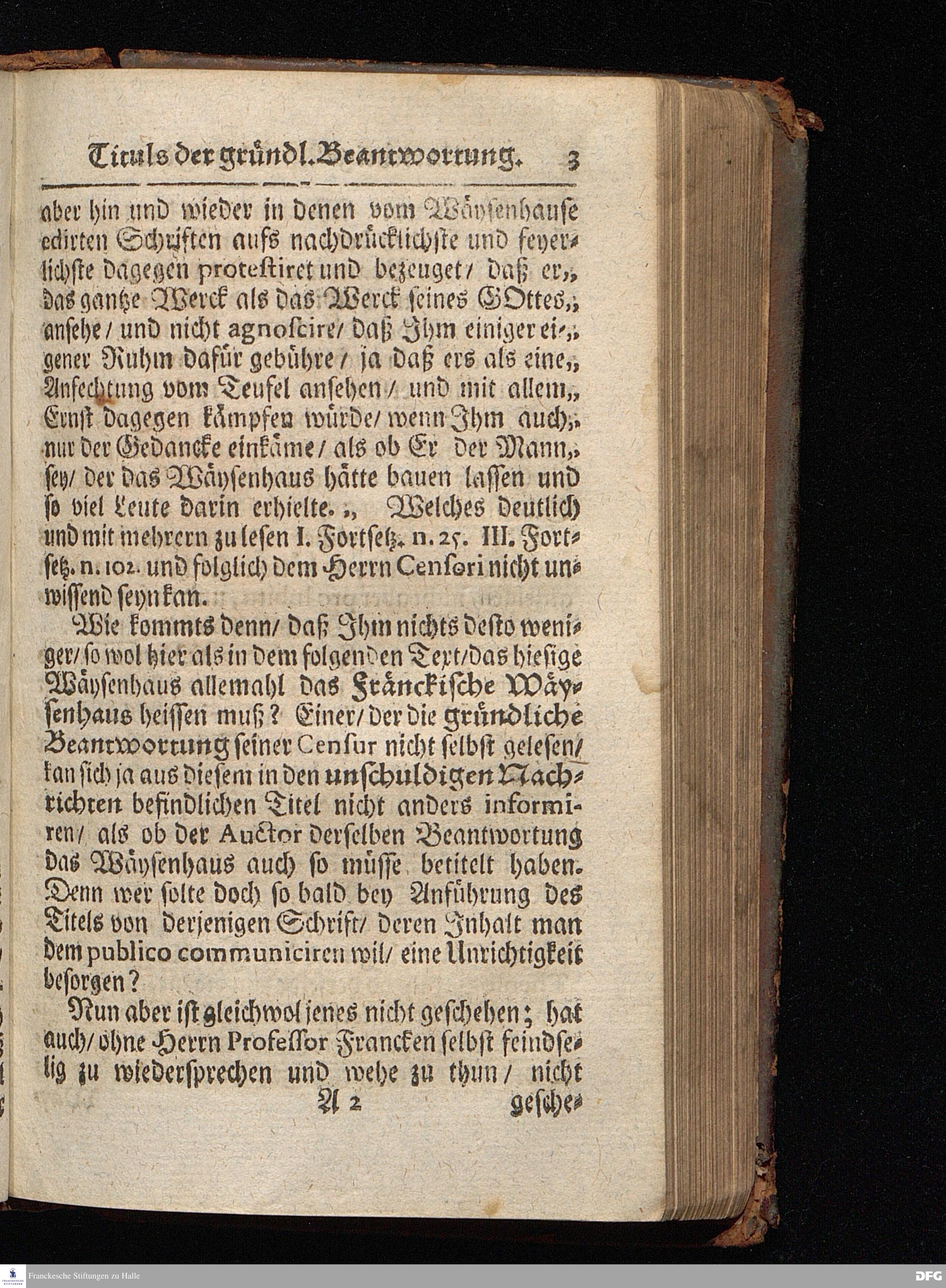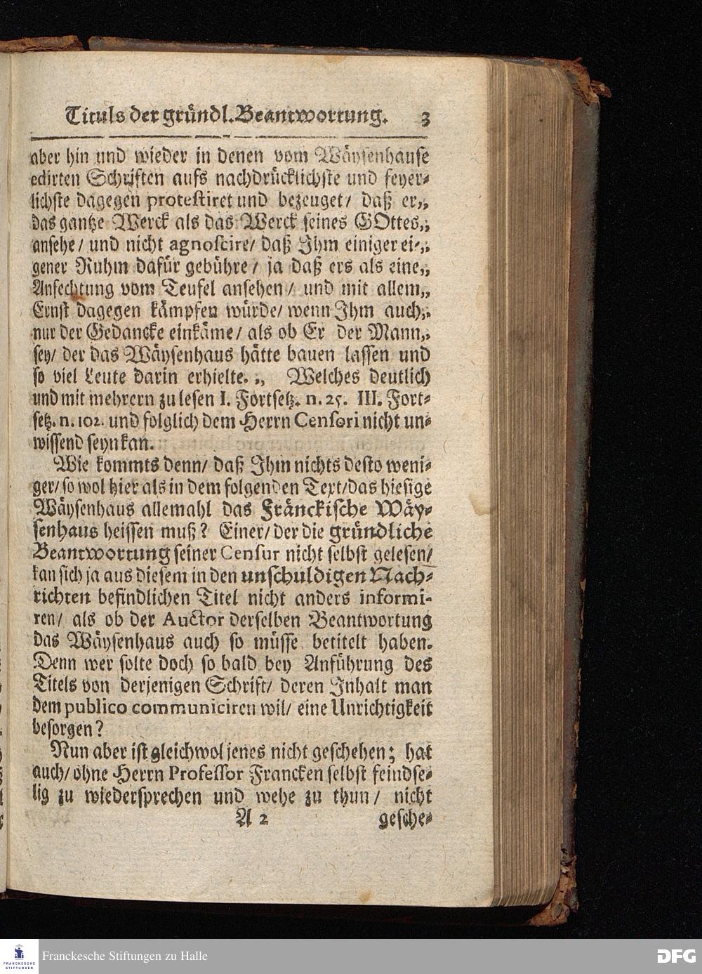 Segens=volle Fußstapfen des noch lebenden und waltenden liebrei=│chen und getreuen GOttes, Zur Beschämung des Unglaubens und Stärckung des Glaubens, entdecket durch eine wahrhafte und umständliche Nachricht von dem Wäysen=Hause und übrigen Anstalten zu Glaucha vor Halle; Welche Im Jahr 1701. zum Druck befördert, ietzo aber zum dritten mal ediret, und bis auf gegenwärtiges Jahr fortgesetzet von August Hermann Francken, S.Theol.Prof.und Past. HALLE, in Verlegung des Wäysen=Hauses, MDCCIX.
