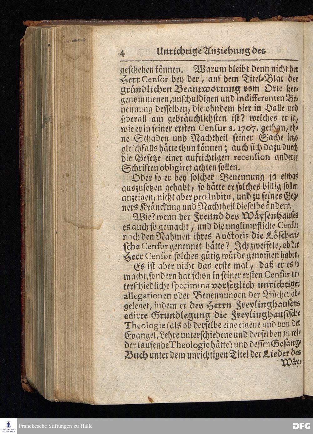 Segens=volle Fußstapfen des noch lebenden und waltenden liebrei=│chen und getreuen GOttes, Zur Beschämung des Unglaubens und Stärckung des Glaubens, entdecket durch eine wahrhafte und umständliche Nachricht von dem Wäysen=Hause und übrigen Anstalten zu Glaucha vor Halle; Welche Im Jahr 1701. zum Druck befördert, ietzo aber zum dritten mal ediret, und bis auf gegenwärtiges Jahr fortgesetzet von August Hermann Francken, S.Theol.Prof.und Past. HALLE, in Verlegung des Wäysen=Hauses, MDCCIX.