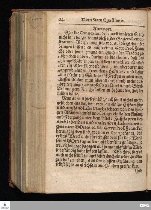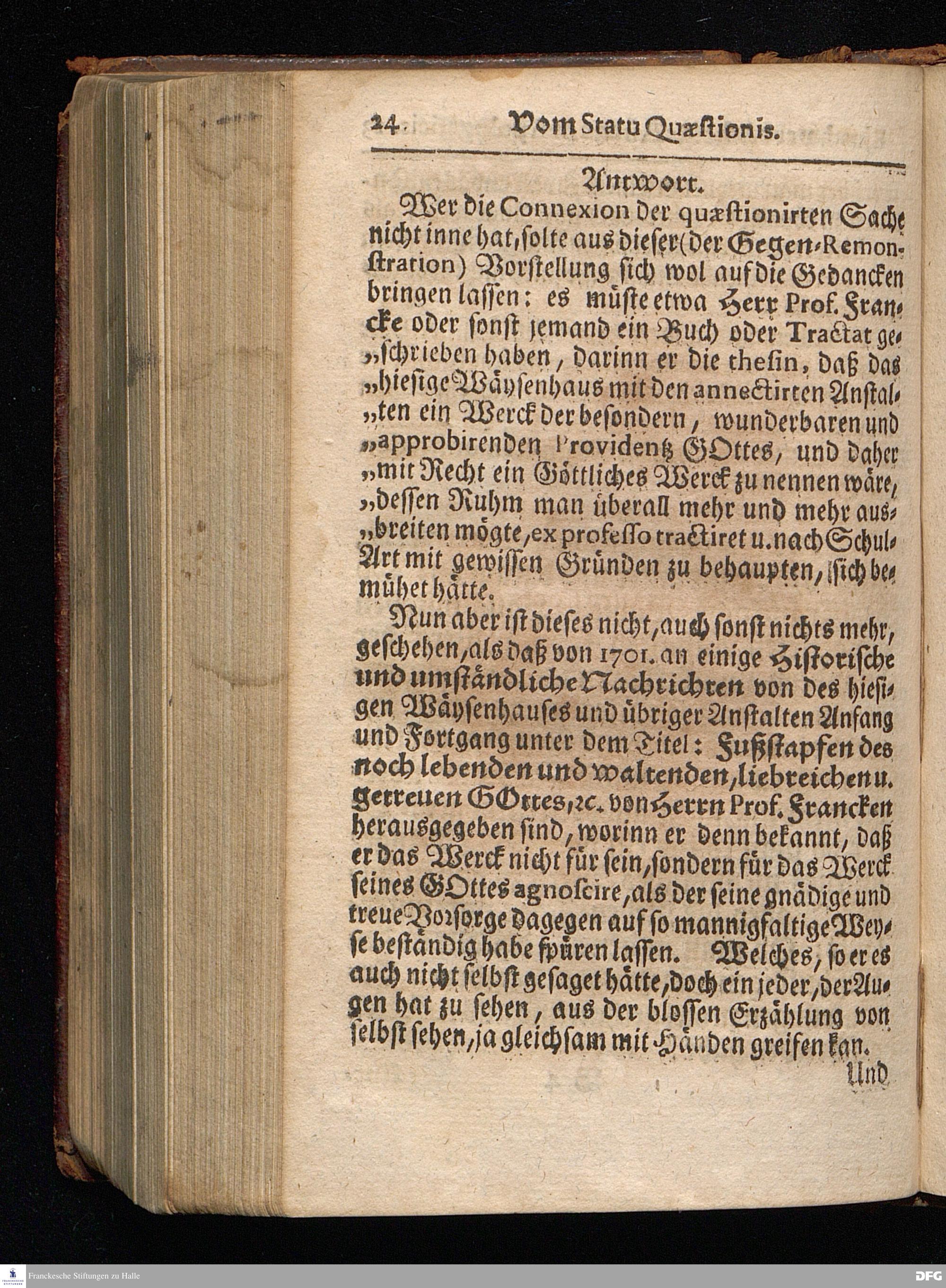 Segens=volle Fußstapfen des noch lebenden und waltenden liebrei=│chen und getreuen GOttes, Zur Beschämung des Unglaubens und Stärckung des Glaubens, entdecket durch eine wahrhafte und umständliche Nachricht von dem Wäysen=Hause und übrigen Anstalten zu Glaucha vor Halle; Welche Im Jahr 1701. zum Druck befördert, ietzo aber zum dritten mal ediret, und bis auf gegenwärtiges Jahr fortgesetzet von August Hermann Francken, S.Theol.Prof.und Past. HALLE, in Verlegung des Wäysen=Hauses, MDCCIX.