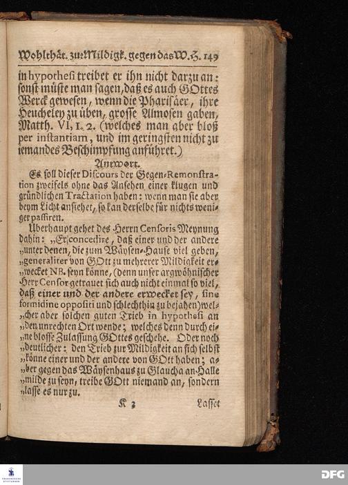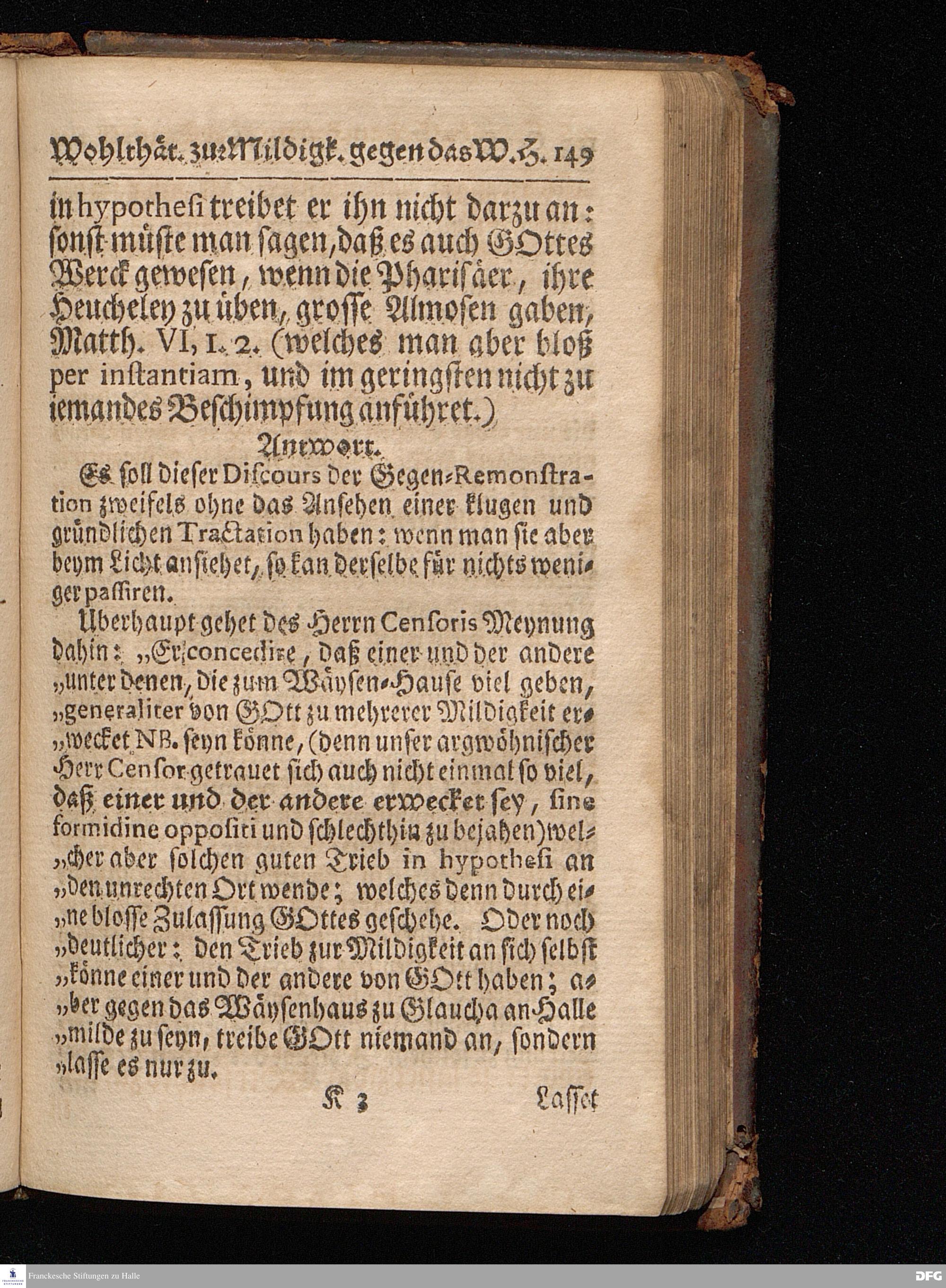 Segens=volle Fußstapfen des noch lebenden und waltenden liebrei=│chen und getreuen GOttes, Zur Beschämung des Unglaubens und Stärckung des Glaubens, entdecket durch eine wahrhafte und umständliche Nachricht von dem Wäysen=Hause und übrigen Anstalten zu Glaucha vor Halle; Welche Im Jahr 1701. zum Druck befördert, ietzo aber zum dritten mal ediret, und bis auf gegenwärtiges Jahr fortgesetzet von August Hermann Francken, S.Theol.Prof.und Past. HALLE, in Verlegung des Wäysen=Hauses, MDCCIX.