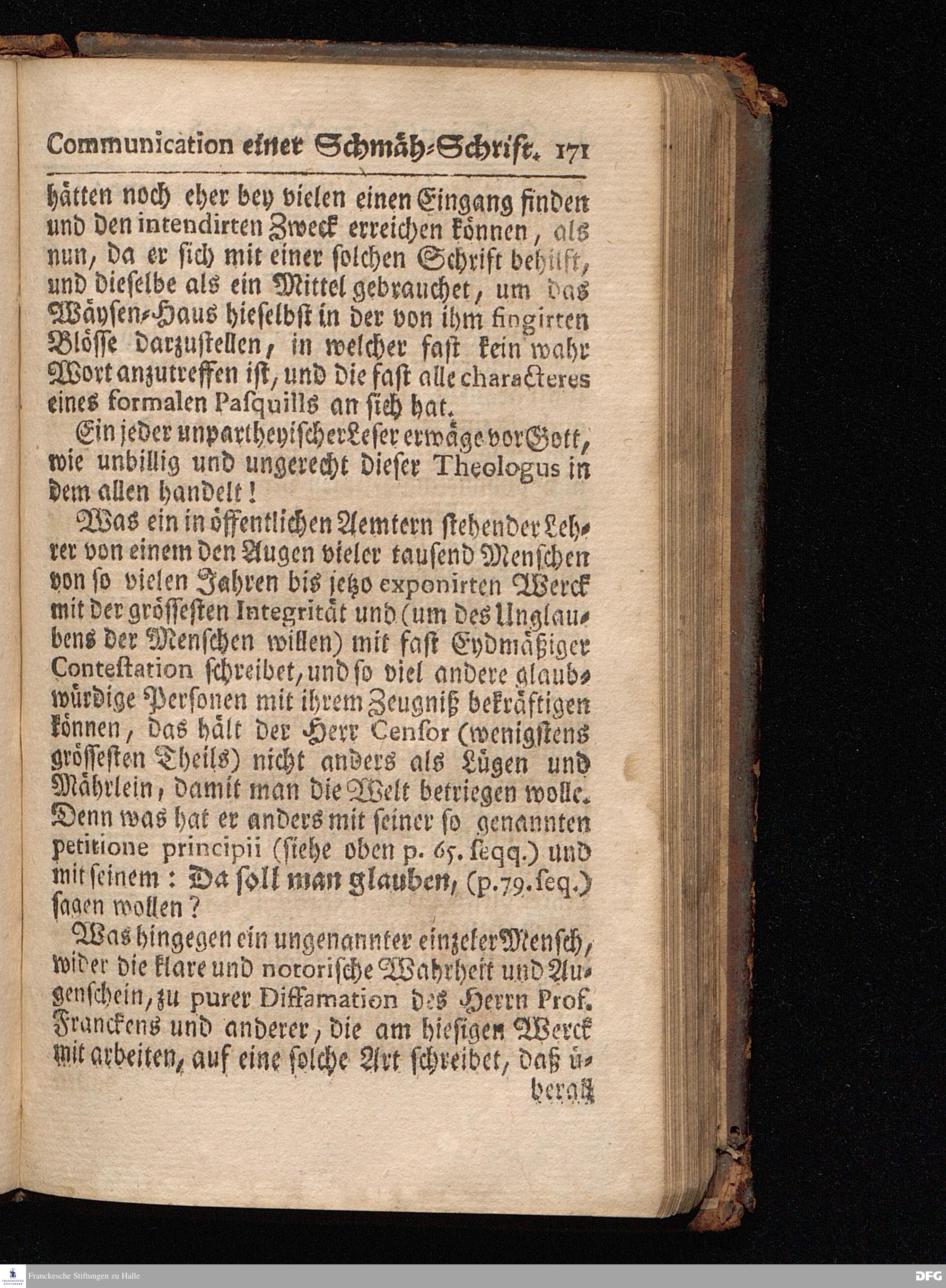 Segens=volle Fußstapfen des noch lebenden und waltenden liebrei=│chen und getreuen GOttes, Zur Beschämung des Unglaubens und Stärckung des Glaubens, entdecket durch eine wahrhafte und umständliche Nachricht von dem Wäysen=Hause und übrigen Anstalten zu Glaucha vor Halle; Welche Im Jahr 1701. zum Druck befördert, ietzo aber zum dritten mal ediret, und bis auf gegenwärtiges Jahr fortgesetzet von August Hermann Francken, S.Theol.Prof.und Past. HALLE, in Verlegung des Wäysen=Hauses, MDCCIX.