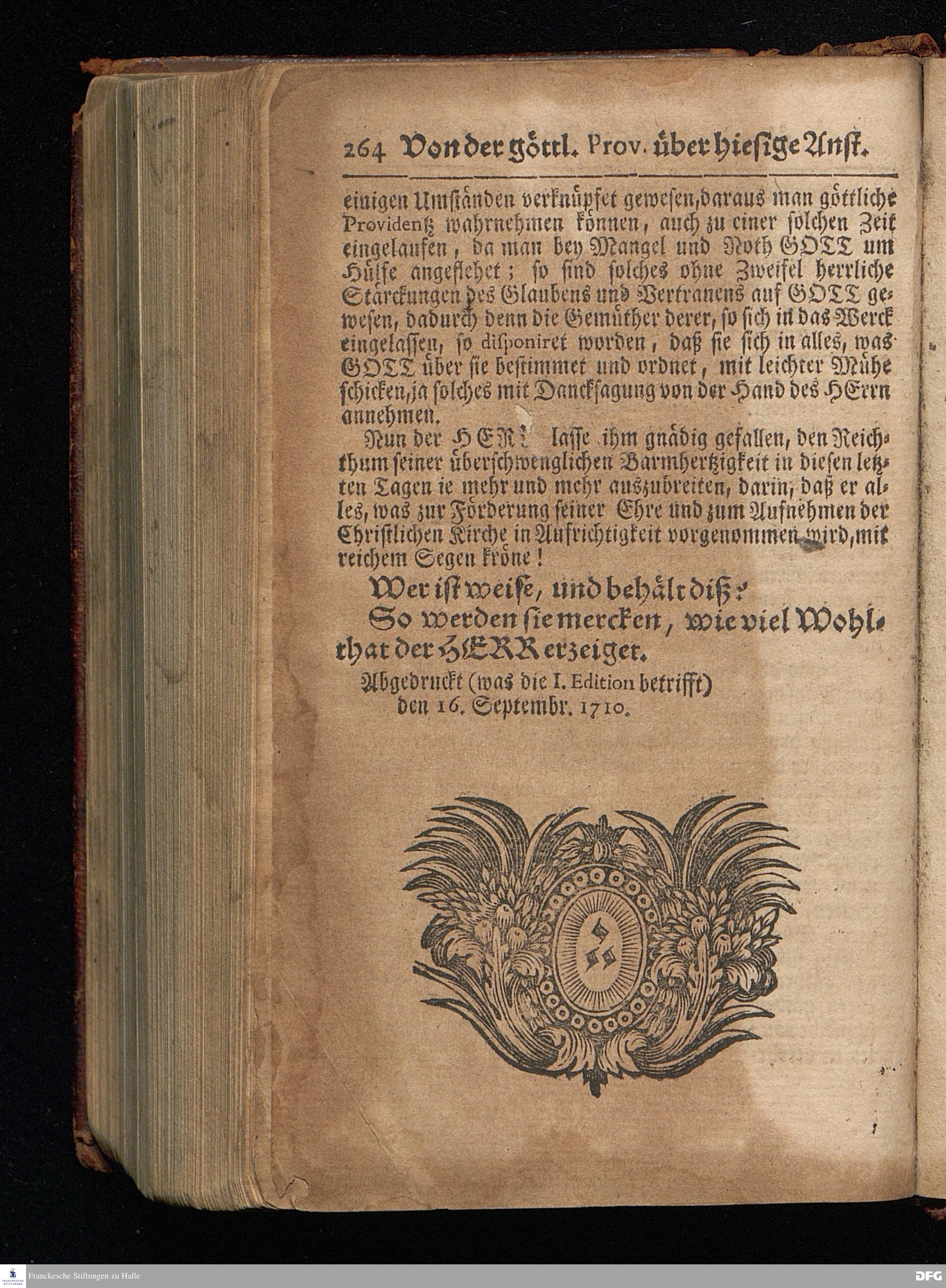 Segens=volle Fußstapfen des noch lebenden und waltenden liebrei=│chen und getreuen GOttes, Zur Beschämung des Unglaubens und Stärckung des Glaubens, entdecket durch eine wahrhafte und umständliche Nachricht von dem Wäysen=Hause und übrigen Anstalten zu Glaucha vor Halle; Welche Im Jahr 1701. zum Druck befördert, ietzo aber zum dritten mal ediret, und bis auf gegenwärtiges Jahr fortgesetzet von August Hermann Francken, S.Theol.Prof.und Past. HALLE, in Verlegung des Wäysen=Hauses, MDCCIX.