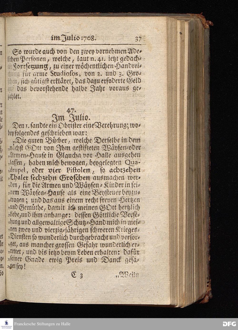 Segens=volle Fußstapfen des noch lebenden und waltenden liebrei=│chen und getreuen GOttes, Zur Beschämung des Unglaubens und Stärckung des Glaubens, entdecket durch eine wahrhafte und umständliche Nachricht von dem Wäysen=Hause und übrigen Anstalten zu Glaucha vor Halle; Welche Im Jahr 1701. zum Druck befördert, ietzo aber zum dritten mal ediret, und bis auf gegenwärtiges Jahr fortgesetzet von August Hermann Francken, S.Theol.Prof.und Past. HALLE, in Verlegung des Wäysen=Hauses, MDCCIX.