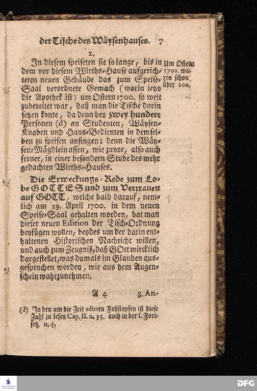 Der von GOTT in dem Wäysenhause zu Glaucha an Halle ietzo bey nahe für 600. Personen Zubereitete Tisch, Nach seinem Anfang, Fortgang, gegenwärtigem Zustand und eingeführter Tisch=Ordnung, kürtzlich beschrieben, mit angehängten Zwey Erweckungs=Reden, Deren die erste Anno 1699.[vielmehr 1700!] bey Einweihung des damaligen kleinern Speise=Saals, Die andere Anno 1711. bey Einweihung des grossen Saals gehalten worden, von August Hermann Francken / S.Theol.Prof.& Past.zu S.Ulrich / und des Gymnasii Scholarcha, [5.Auflage.] HALLE, in Verlegung des Wäysenhauses. 1722.