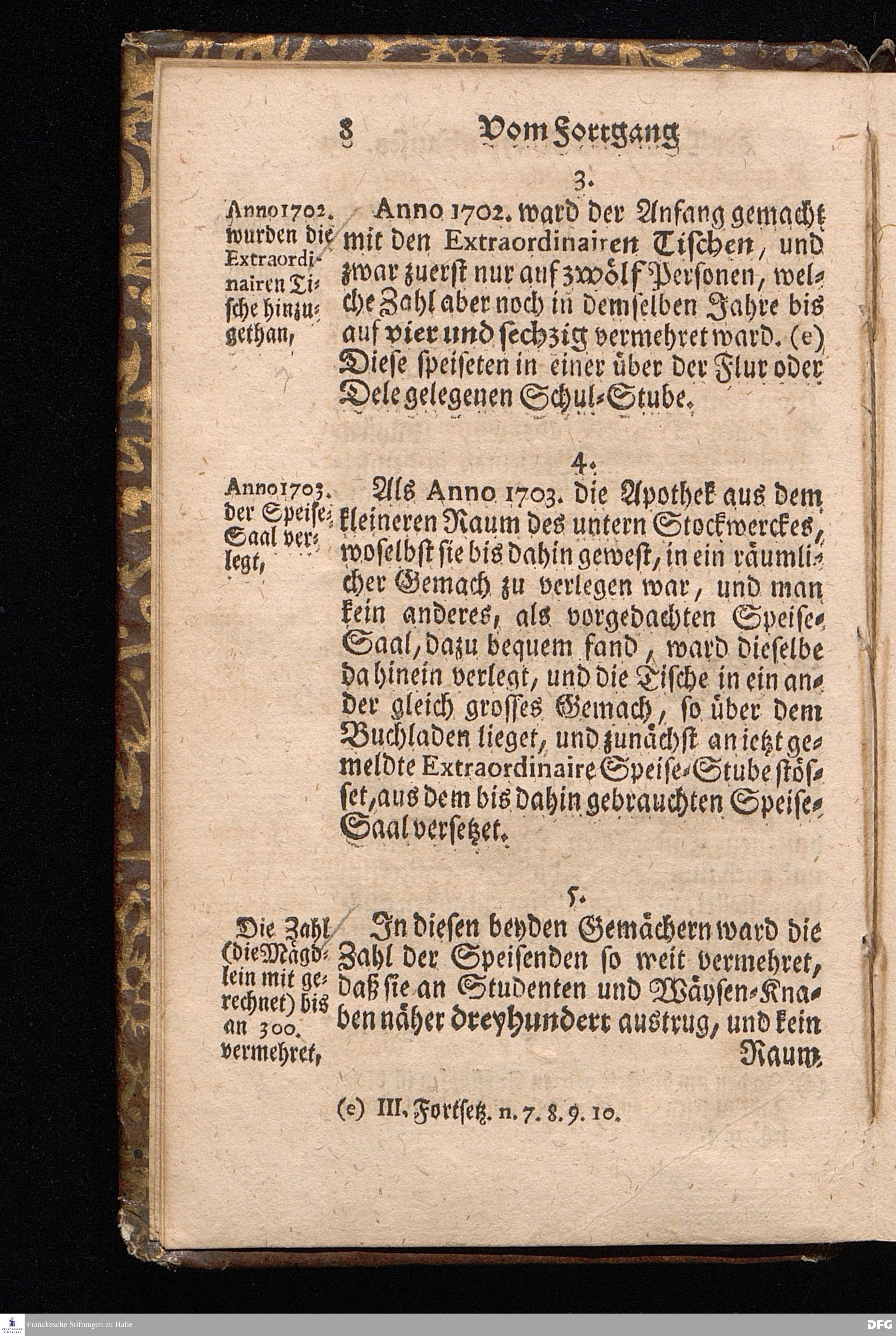 Der von GOTT in dem Wäysenhause zu Glaucha an Halle ietzo bey nahe für 600. Personen Zubereitete Tisch, Nach seinem Anfang, Fortgang, gegenwärtigem Zustand und eingeführter Tisch=Ordnung, kürtzlich beschrieben, mit angehängten Zwey Erweckungs=Reden, Deren die erste Anno 1699.[vielmehr 1700!] bey Einweihung des damaligen kleinern Speise=Saals, Die andere Anno 1711. bey Einweihung des grossen Saals gehalten worden, von August Hermann Francken / S.Theol.Prof.& Past.zu S.Ulrich / und des Gymnasii Scholarcha, [5.Auflage.] HALLE, in Verlegung des Wäysenhauses. 1722.