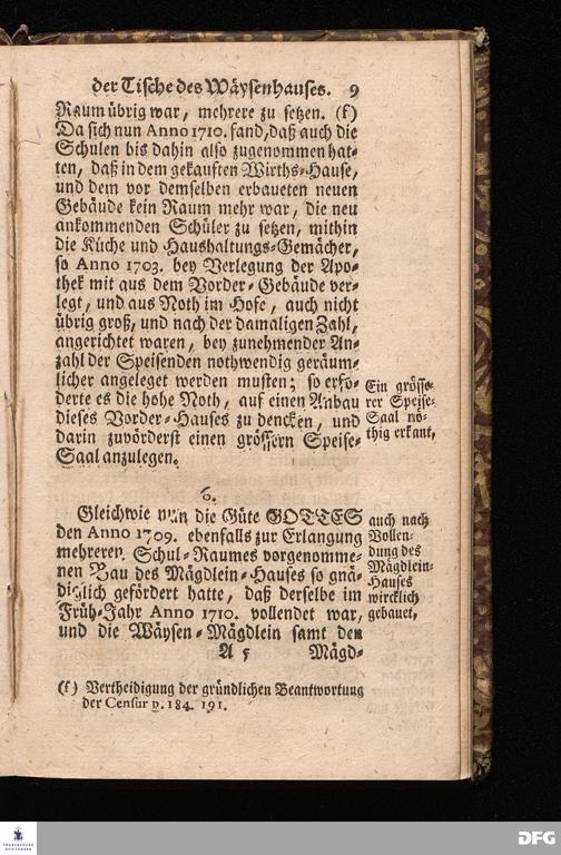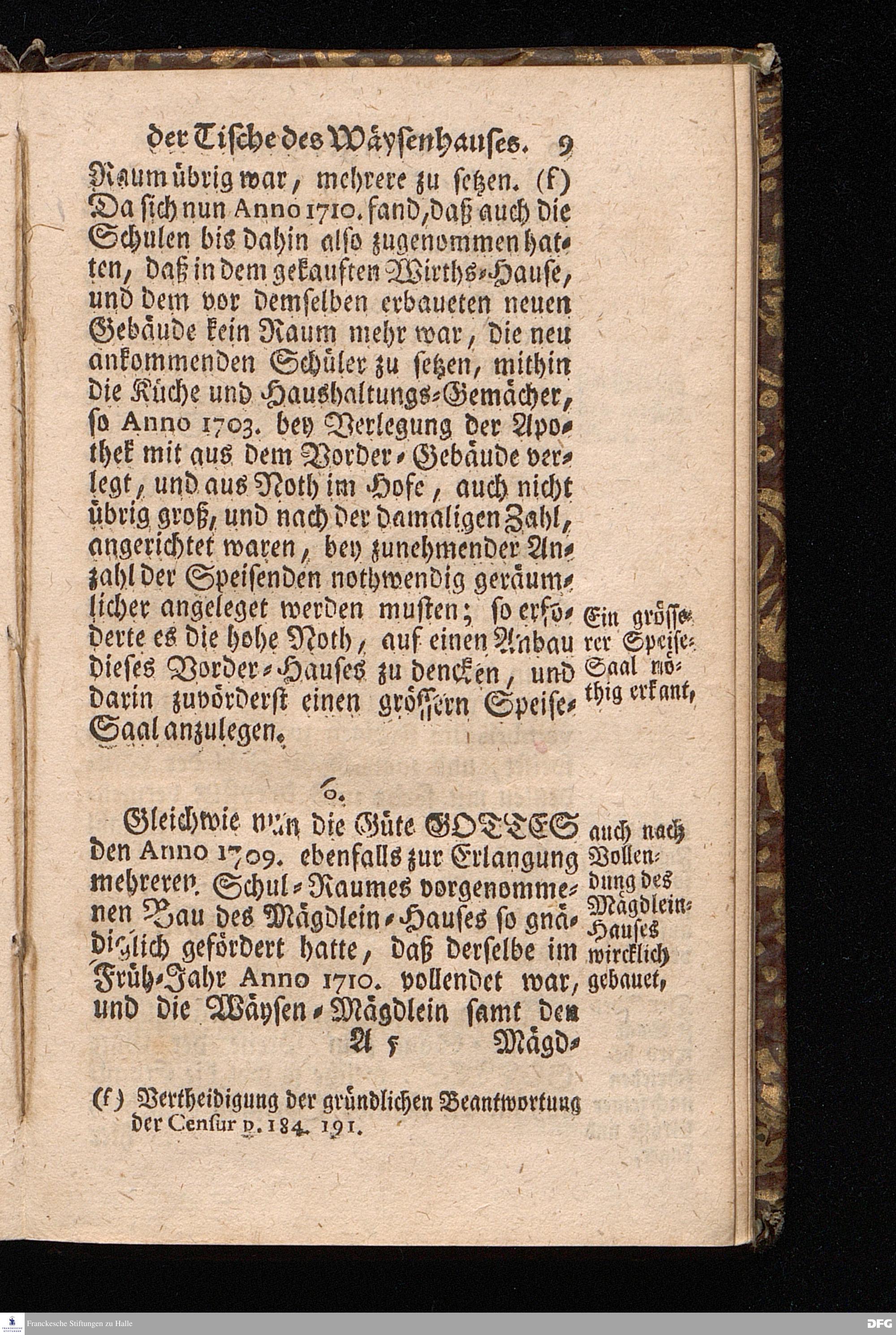 Der von GOTT in dem Wäysenhause zu Glaucha an Halle ietzo bey nahe für 600. Personen Zubereitete Tisch, Nach seinem Anfang, Fortgang, gegenwärtigem Zustand und eingeführter Tisch=Ordnung, kürtzlich beschrieben, mit angehängten Zwey Erweckungs=Reden, Deren die erste Anno 1699.[vielmehr 1700!] bey Einweihung des damaligen kleinern Speise=Saals, Die andere Anno 1711. bey Einweihung des grossen Saals gehalten worden, von August Hermann Francken / S.Theol.Prof.& Past.zu S.Ulrich / und des Gymnasii Scholarcha, [5.Auflage.] HALLE, in Verlegung des Wäysenhauses. 1722.