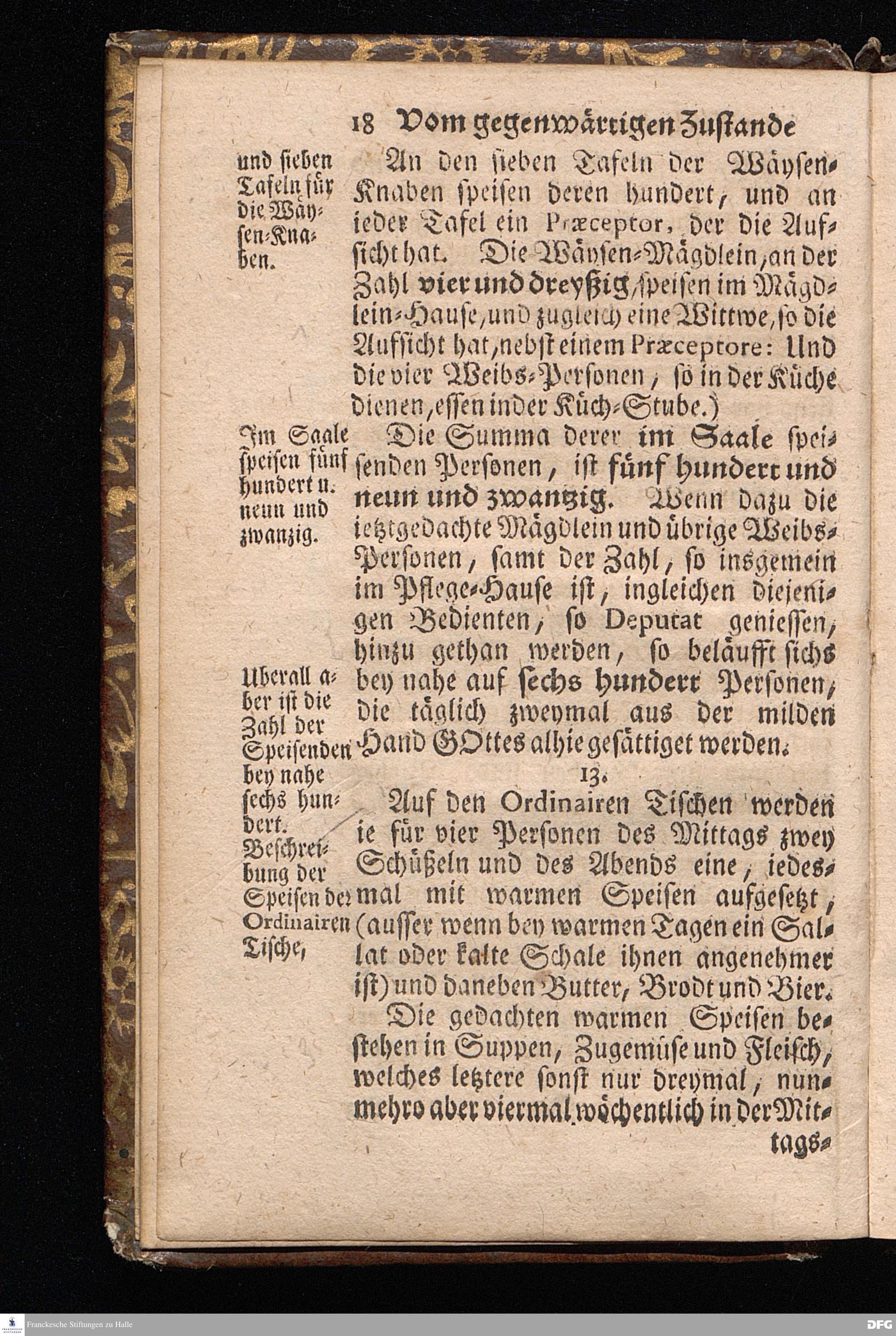 Der von GOTT in dem Wäysenhause zu Glaucha an Halle ietzo bey nahe für 600. Personen Zubereitete Tisch, Nach seinem Anfang, Fortgang, gegenwärtigem Zustand und eingeführter Tisch=Ordnung, kürtzlich beschrieben, mit angehängten Zwey Erweckungs=Reden, Deren die erste Anno 1699.[vielmehr 1700!] bey Einweihung des damaligen kleinern Speise=Saals, Die andere Anno 1711. bey Einweihung des grossen Saals gehalten worden, von August Hermann Francken / S.Theol.Prof.& Past.zu S.Ulrich / und des Gymnasii Scholarcha, [5.Auflage.] HALLE, in Verlegung des Wäysenhauses. 1722.